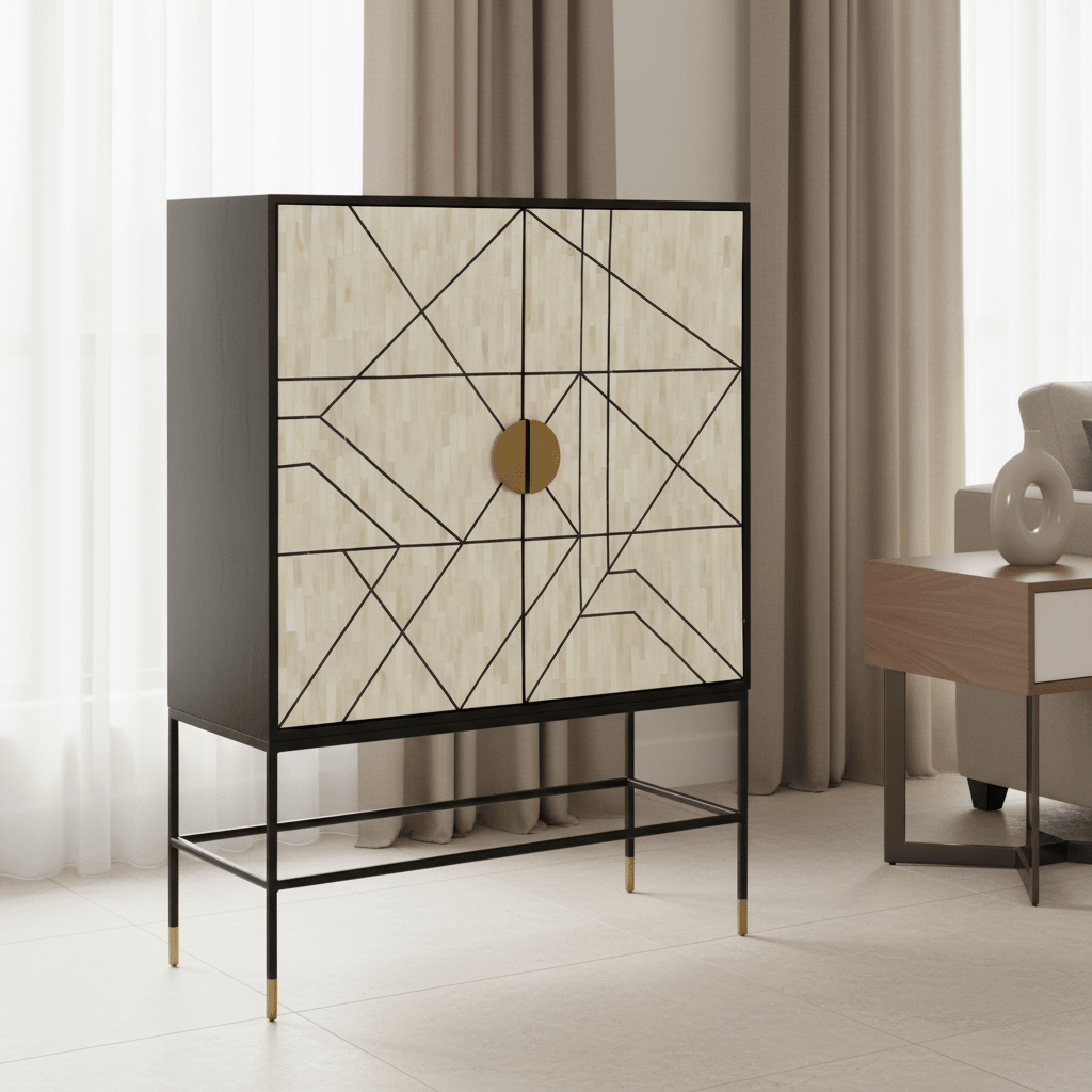 An aesthete's delight. The Shaws cabinet is a luxurious affair of solid mango wood and ornate bone veneer. Two large doors open up to an abundance of shelving space. Brass details finish off this imposing piece. وحدة تخزين Item Material: Solid Mango Cabinet, Bone Veneer, Iron Base, MDF Item Color: Multi Item Height: 139.7 Item Width: 101.6 Item Depth: 40.64