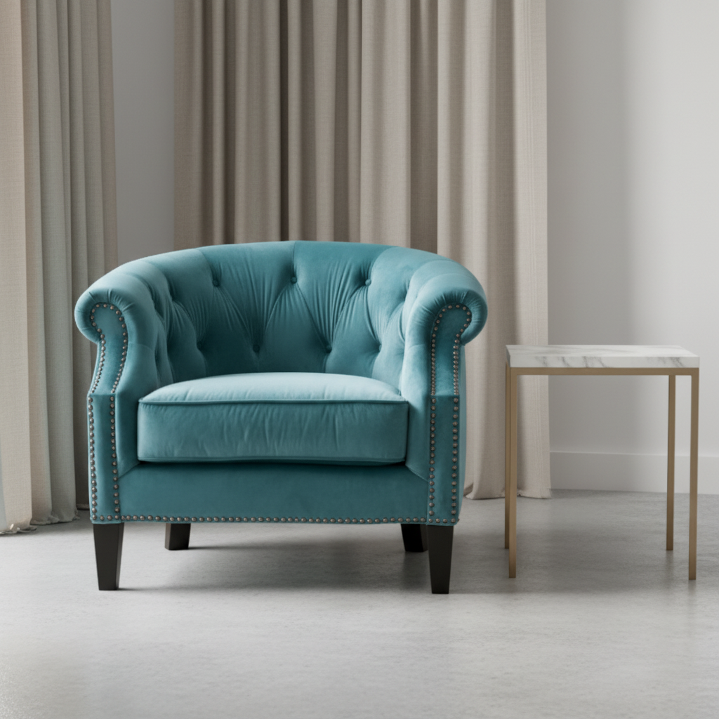 An antique design to embrace traditions, giving plush elegance and a sense of classic. This Cerulean blue velvet Chair by Roots with its regal details is the perfect addition to your space