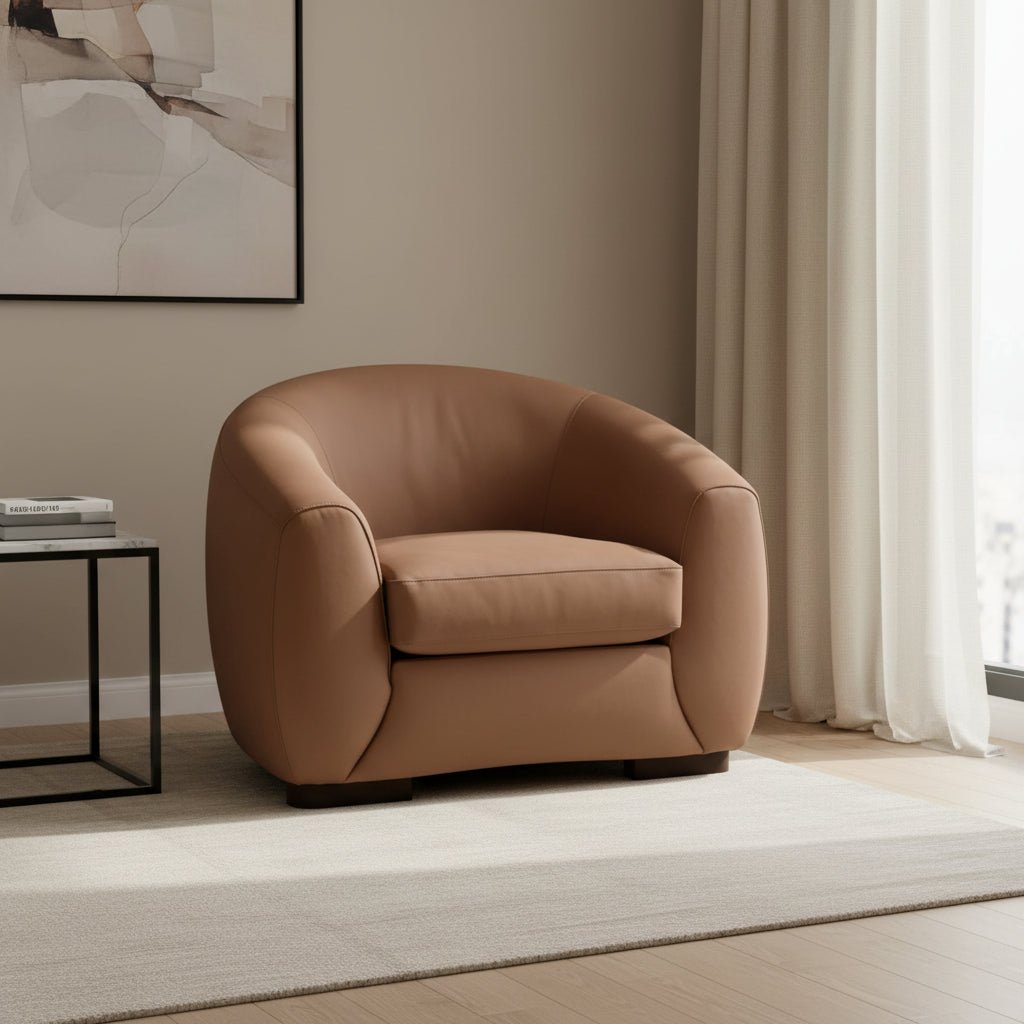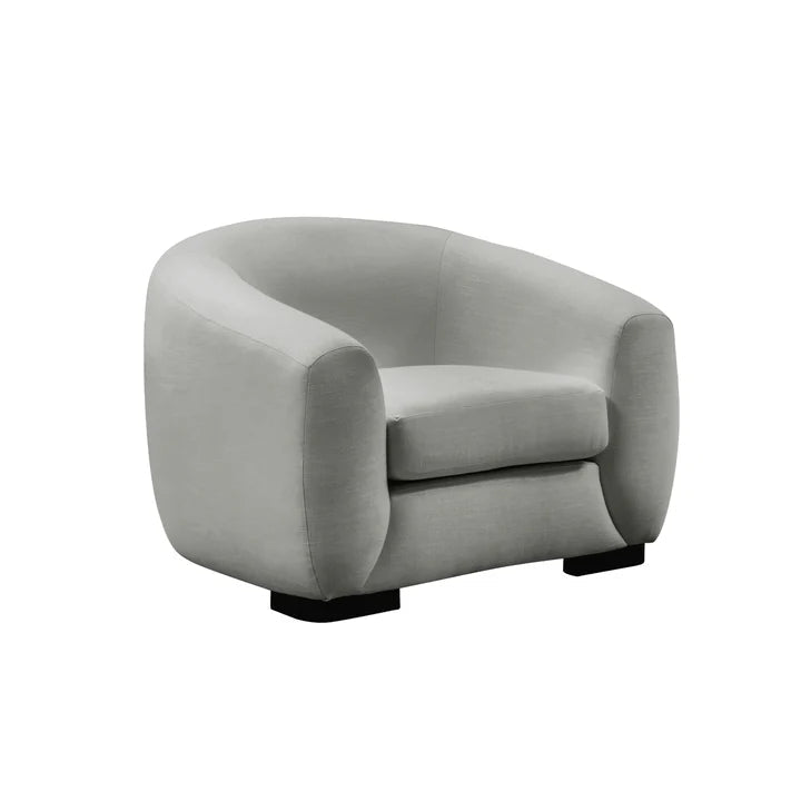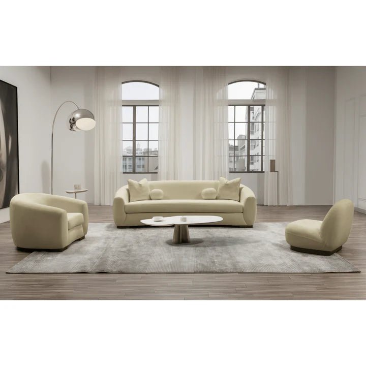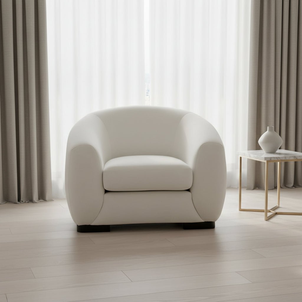 Curvaceous design is wrapped in a creamy Beige boucle that brings soft texture and dimension to the piece