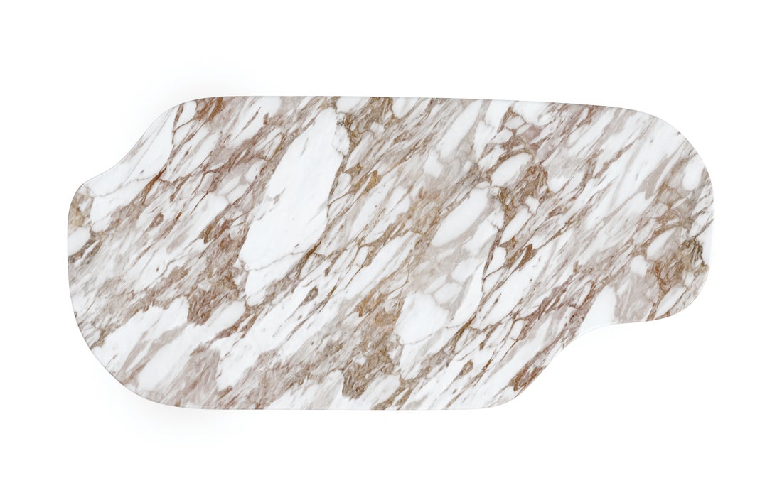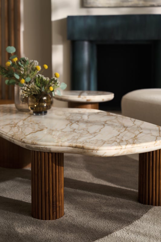 Boldly modern in a mix of wood and marble, this cocktail table grounds the room with an unforgettable presence. Artfully defining its fluid, organic shape: a highly figured, sculpted Calcutta Oro stone top with warm caramel veining. Reeding details add tactile appeal and striking contrast to table legs in a Retro Walnut finish. Pair with our Seychelles accent table for greater surface and dimension.