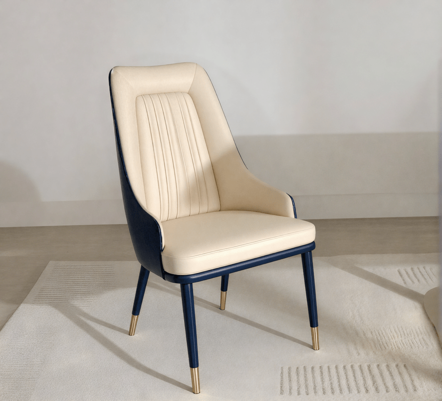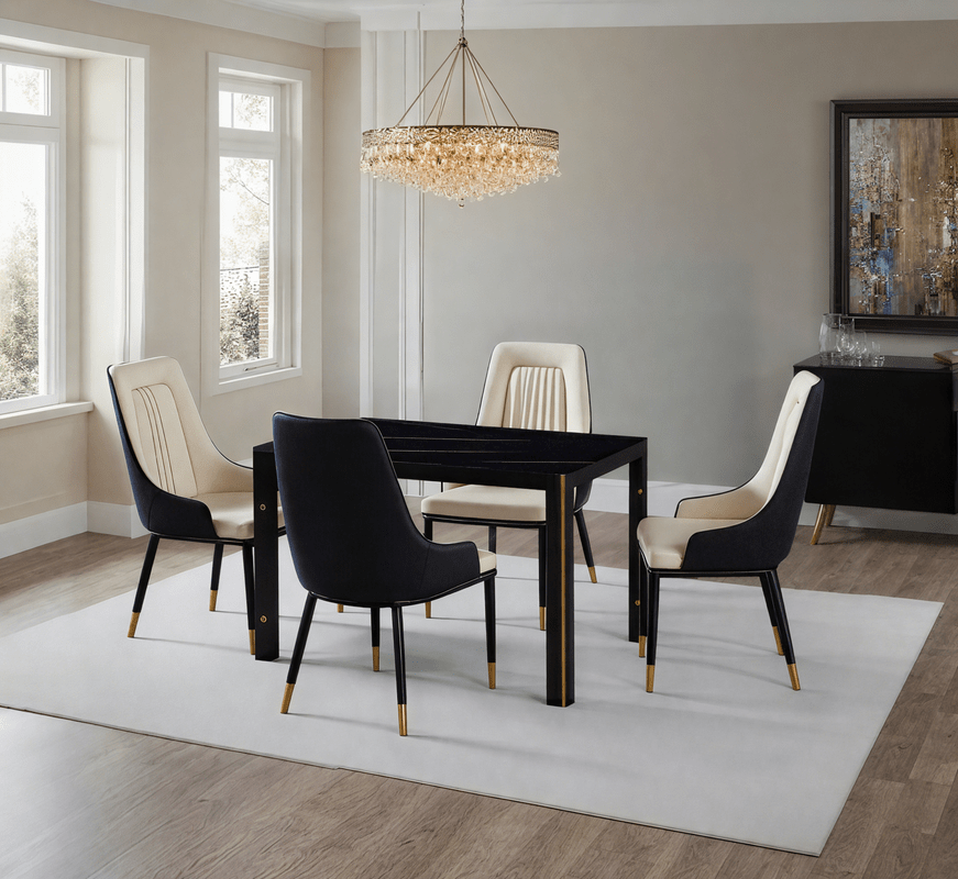 Modern dining set with 4 chairs and a black artificial marble table with golden accents.