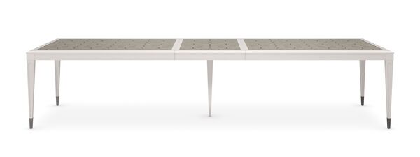 Elevate any occasion with this exquisite glass top dining table, featuring mirrored panels embellished in Soft Silver paint to create a Moroccan-tiled, geometric pattern. A shimmering Stardust finish dramatically defines its solid wood frame with tall, tapered legs capped in Deep Bronze metal ferrules. Accommodates up to 14 guests when fully extended