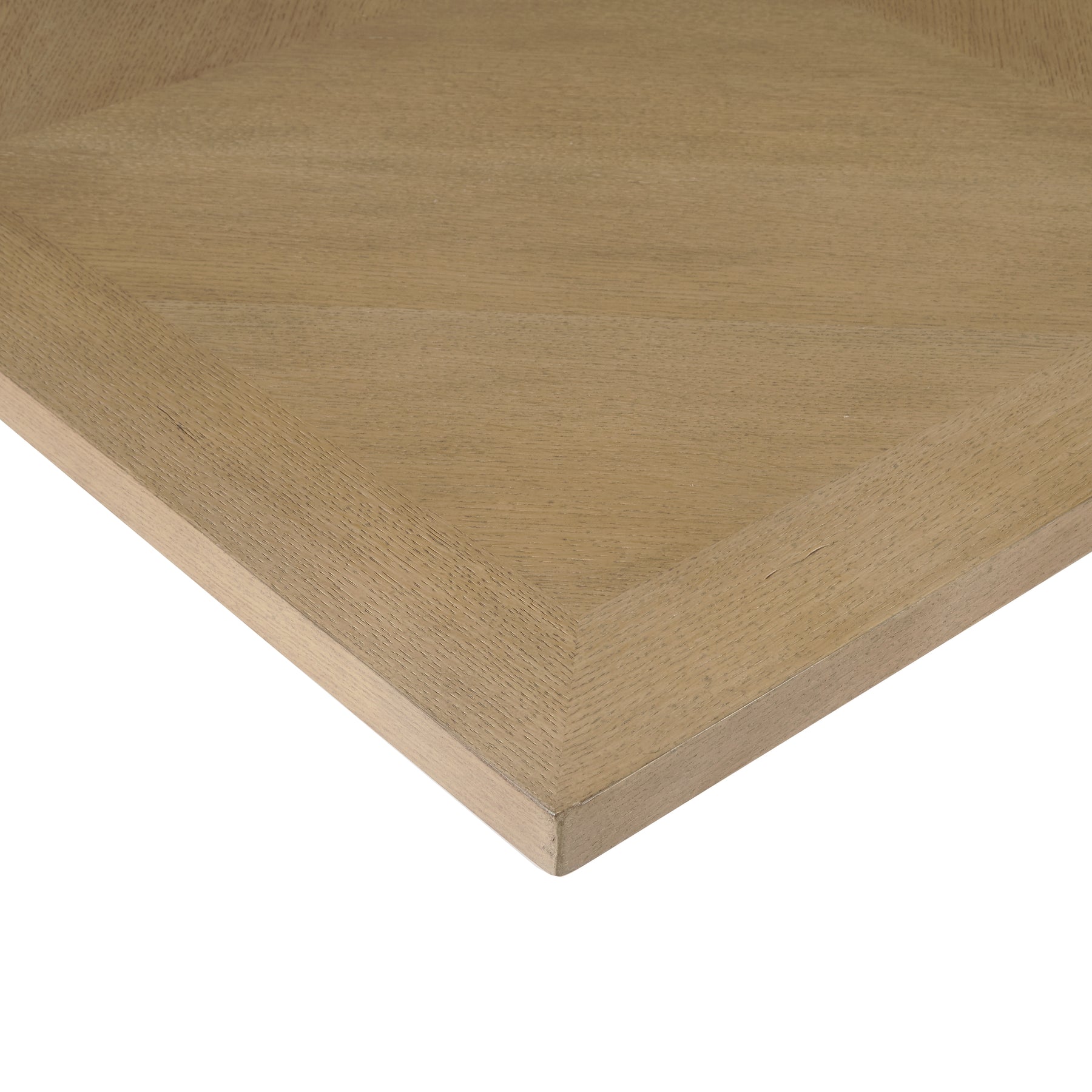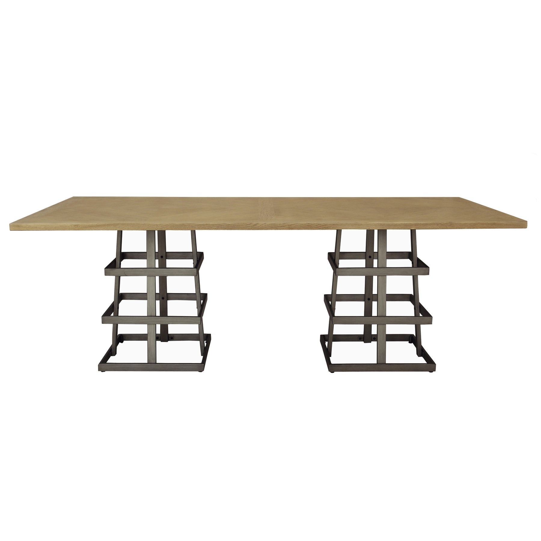 Appealing dining table design mixes elements of industrial flair with an airy, casual color palette,Double-pedestal design offers ample room for friends, family, and guests to gather,Light blonde-finished top is accented with natural wood graining and subtle patterning,Strapped metal pedestal design offers sturdy support without weighing down the profile,Built with select hardwoods, manufactured wood, veneers, and metal for longevity,Assembly is required; two people are recommended to complete table setup