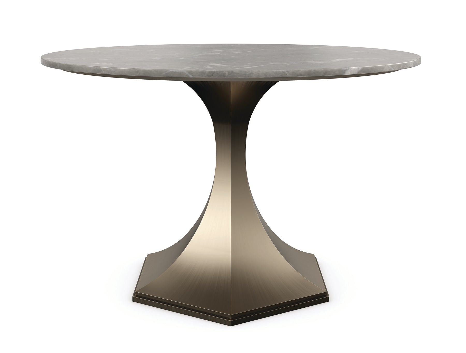 Rising to the occasion in any interior, this 48” pedestal table is well-scaled for an entryway, library or smaller dining space. Features a luxurious, yet durable, grey sintered stone top with the classic look of veined marble, perfectly poised on a cinched fluted base in a Brushed Antique Brass finish. Accommodates up to six seats when styled as a dining table.