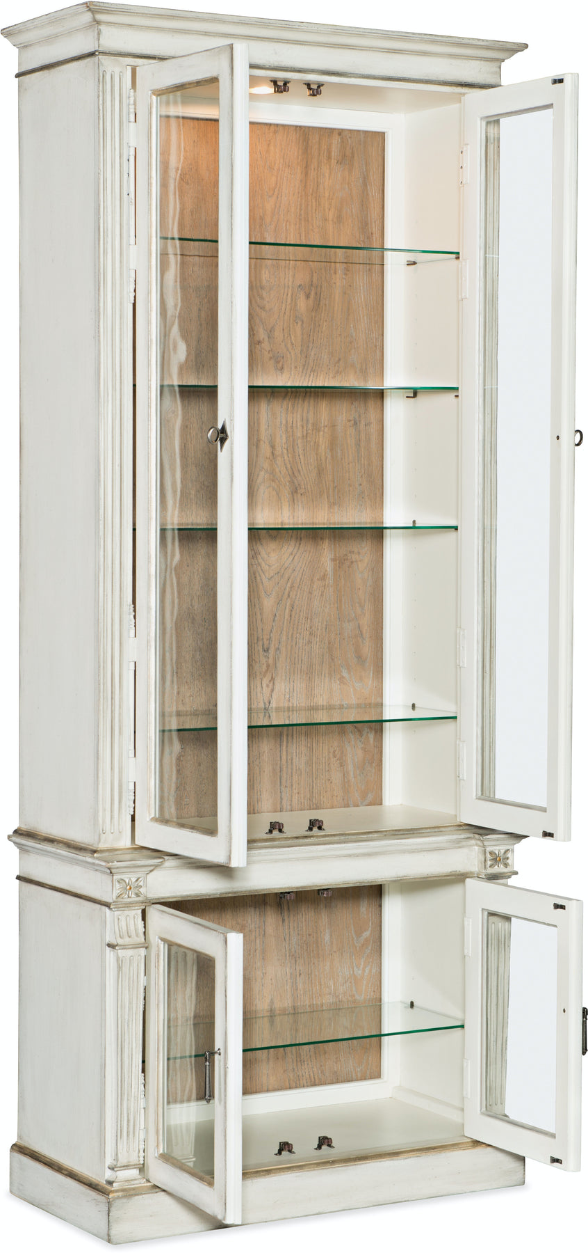 Can you say fashion runway? Tall and slim, the Sanctuary Display Cabinet demands a second look. With its compact 38-inch width and 18-inch depth, this versatile piece can add style and storage to so many spots in your home. The lovely finish is Blanc, a creamy white with champagne and silver tipping. The back panel is reversible with the dark Noir on one side and the light wood Le Sable on the other. There are four lightly seeded glass doors, with 3 adjustable glass shelves in the upper section and one in the lower section. To show off your collectibles, there is a light with a 3-intensity touch switch. The ring and bail pulls are in an antique silver color.