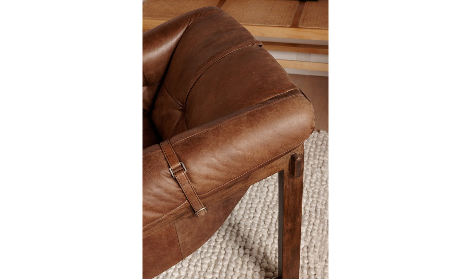 A Mid-Century delight, the Bellos Accent Chair features tactile allure upholstered in rich top-grain leather that will only mellow with age. Strapped detailing is matched with a low-slung silhouette and lightly tufted seat, an invitation to statement, comfort and relaxation.