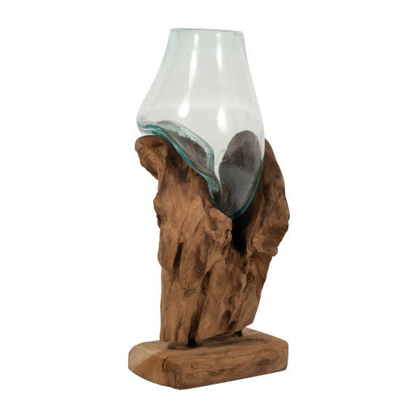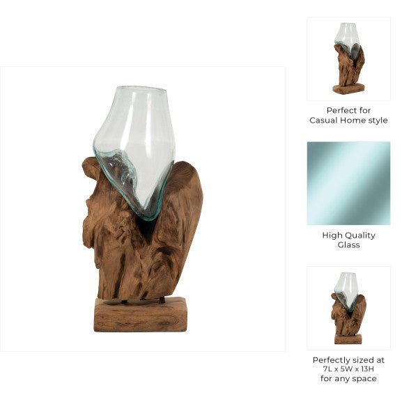 GLASS 13"H VASE IN WOOD STAND, BROWN