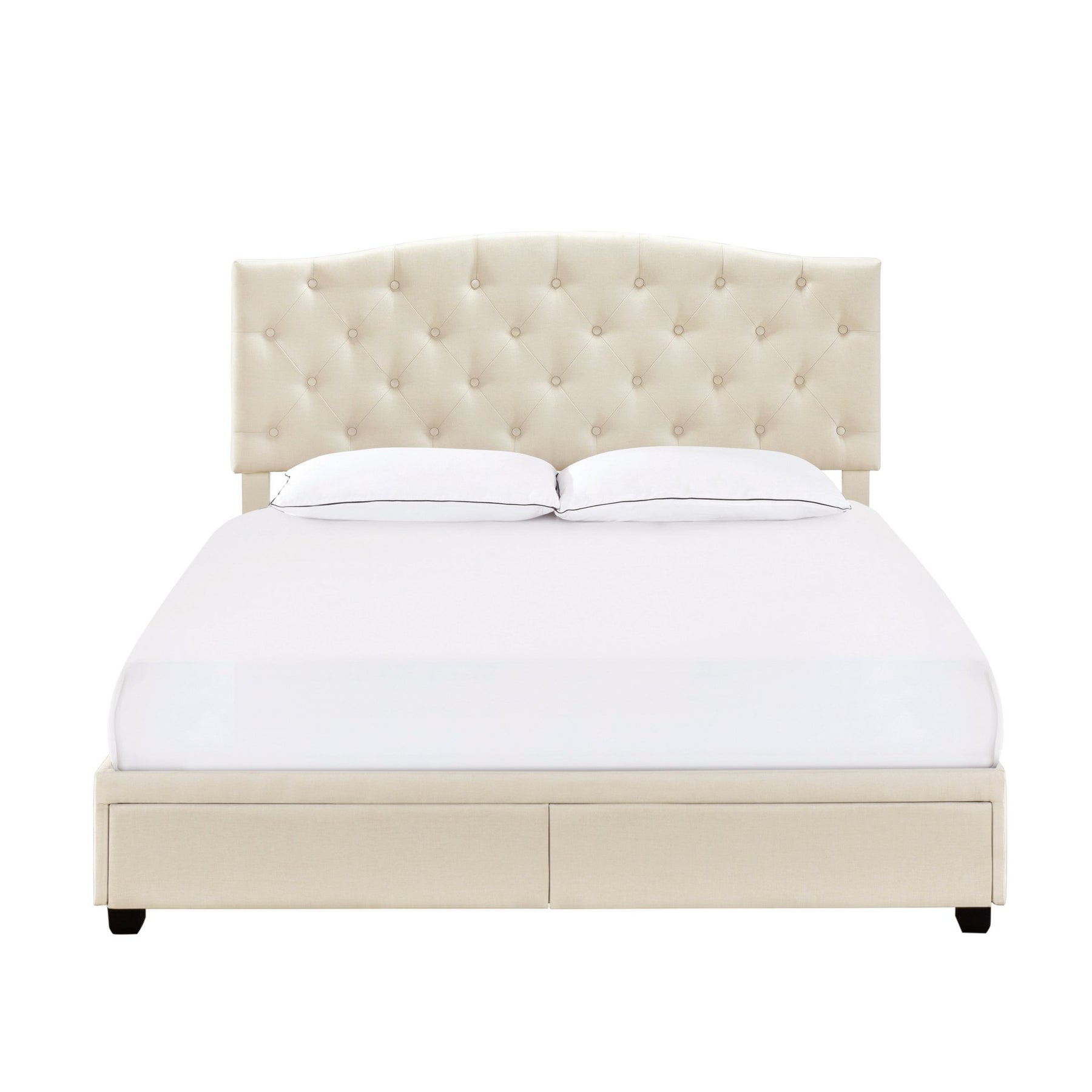 A mix of casual and traditional styled headboard with linen-like fabric wrapped around entire bed frame.,Two storage drawers at the foot of the bed. The headboard is able to adjust to various different mattress heights.,The fabric of this headboard is a linen-like feel with simple, yet traditional diamond-stitched button tufting.,,Constructed of modern fabric and select woods for an affordable take on a designer look,Some assembly required; hardware kit and instructions included