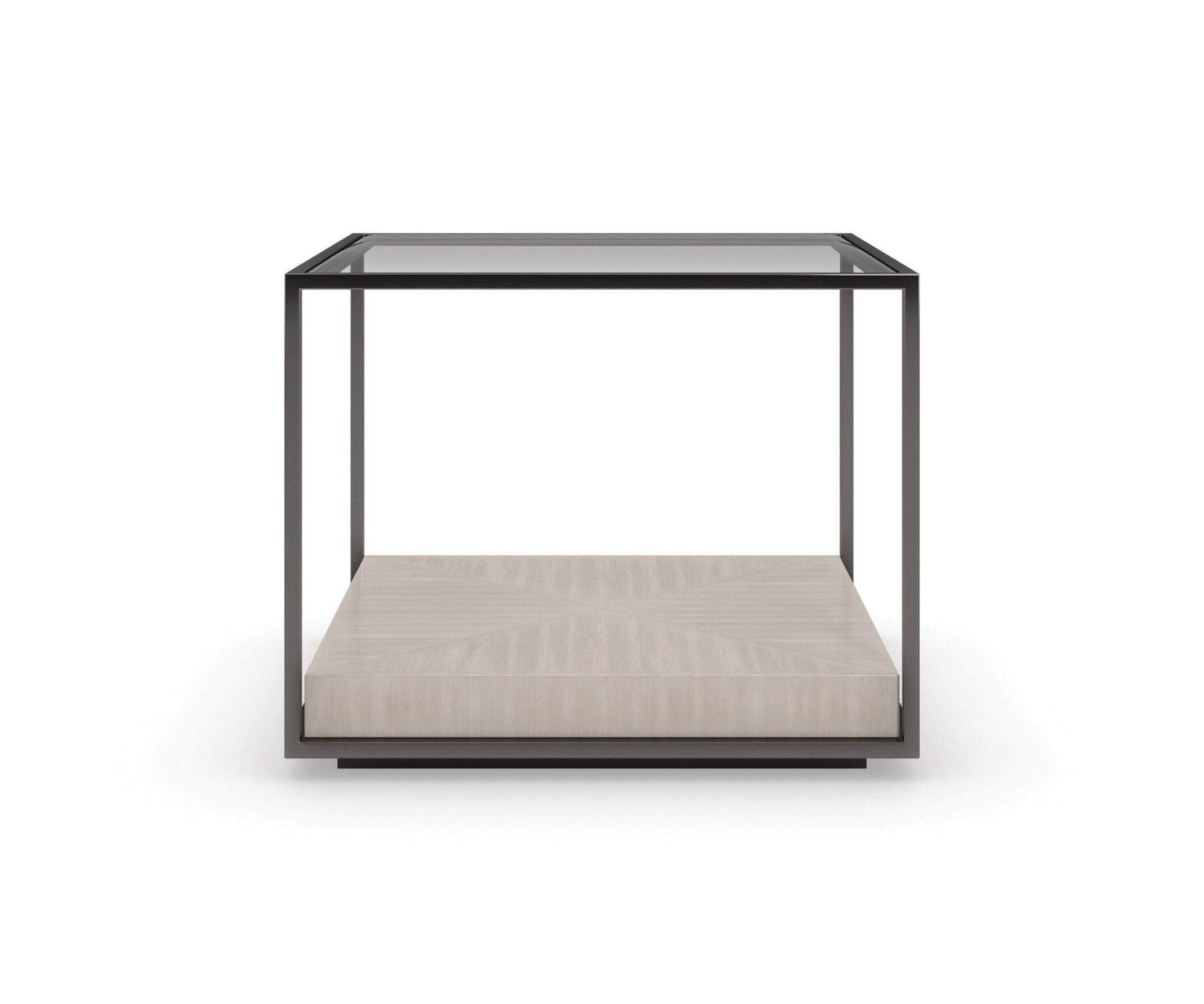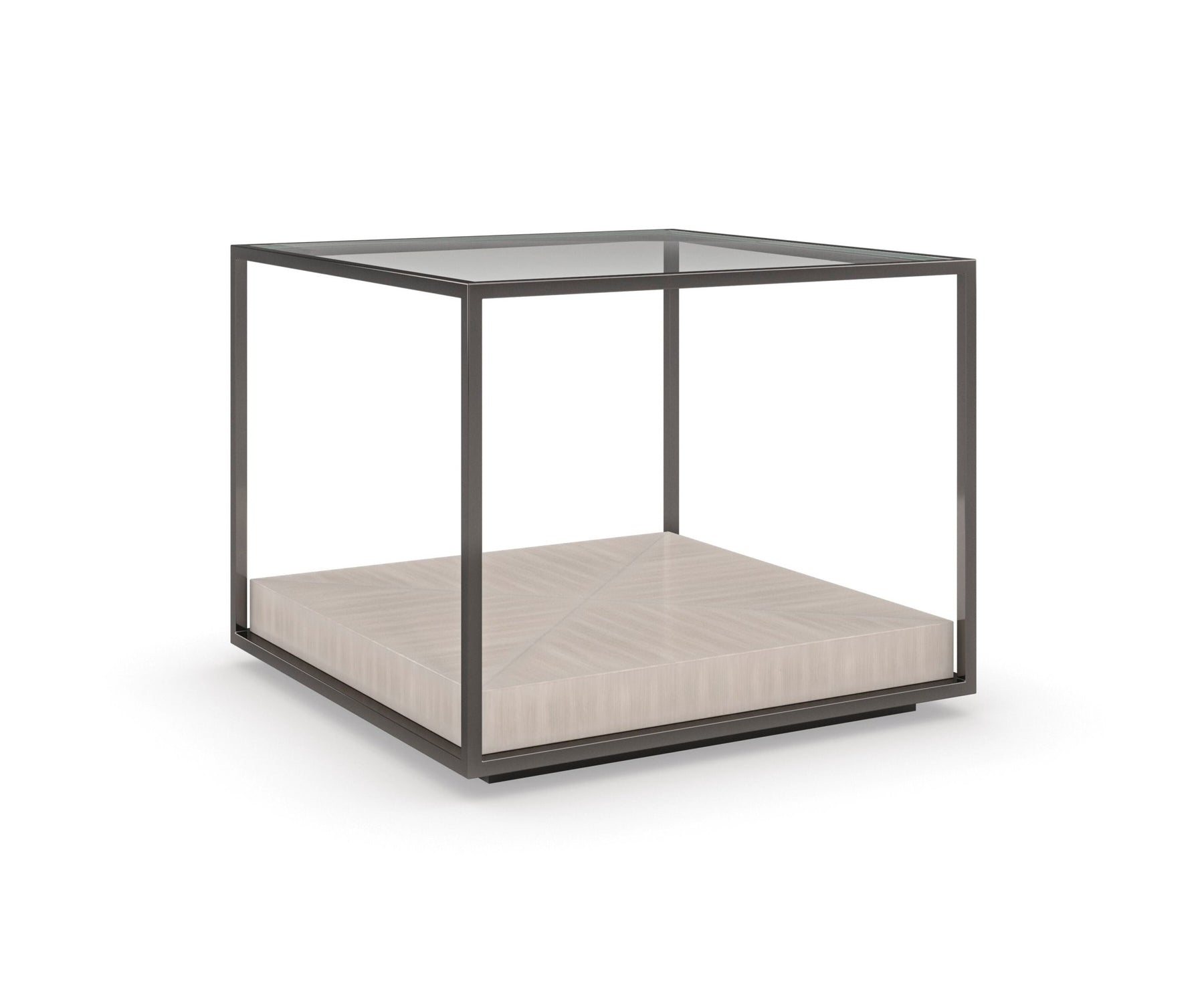 Bunched or single, this architectural design lets you create an ever-changing cocktail table that’s open to interpretation. Framed in Deep Bronze metal, a butcher block shelf in a pearlescent Moonstone finish illuminates the linear grain of Koto veneers. Topped in glass with a beveled edge, it’s visually light, with an elevated, casual style. Pair with our Solid Ground cocktail table, wrapped in faux shagreen, to create a multi-dimensional, layered collection with luxe appeal.