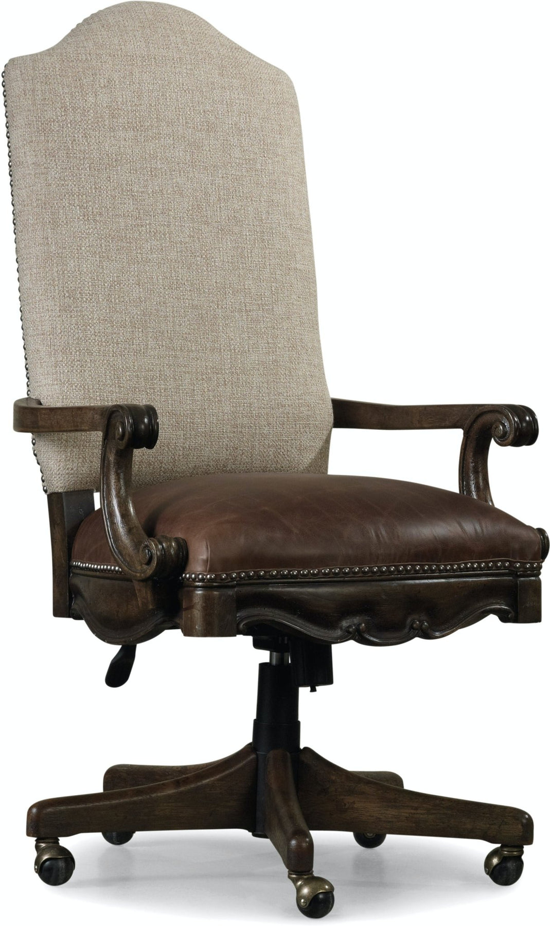 Class and comfort come together in an impassioned marriage of casual elegance in the Rhapsody Tilt Swivel Chair, combining a top grain leather seat with a fabric back in the soft neutral Aurora Ecru color. The walnut-colored reclaimed rustic finish adds the final touch of laid-back luxury. Features a tilt swivel mechanism with a pneumatic gas lift and casters.