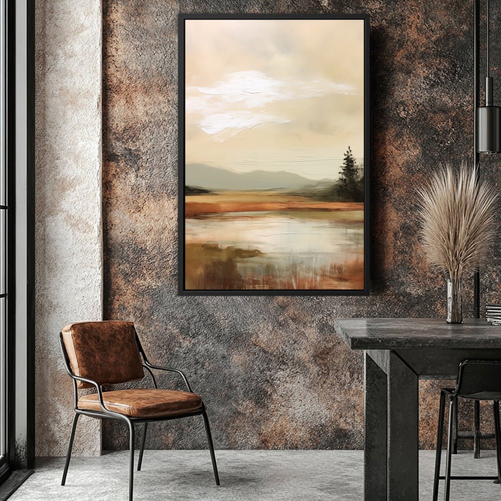 Canvas Wall Art Stretched Over Wooden Frame with Floating Frame and Sun On Lake Oil Painting Painting CV4246