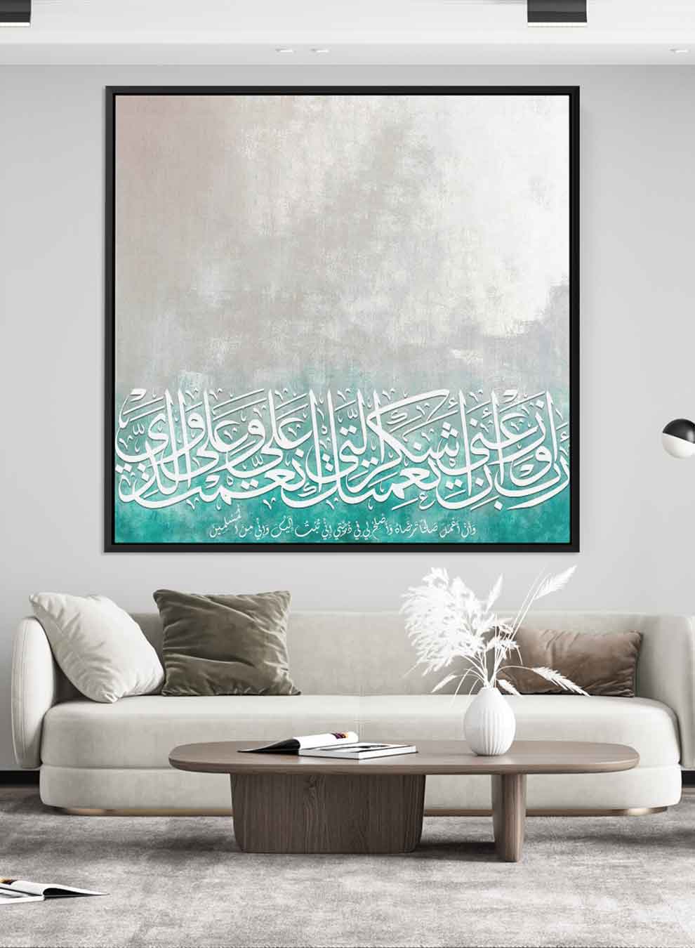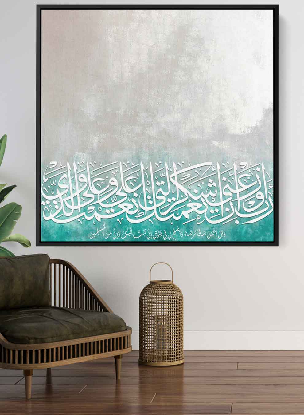 Square Canvas Wall Art Stretched Over Wooden Frame with Black Floating Frame and Islamic Quran Surah Al-Baqarah Painting