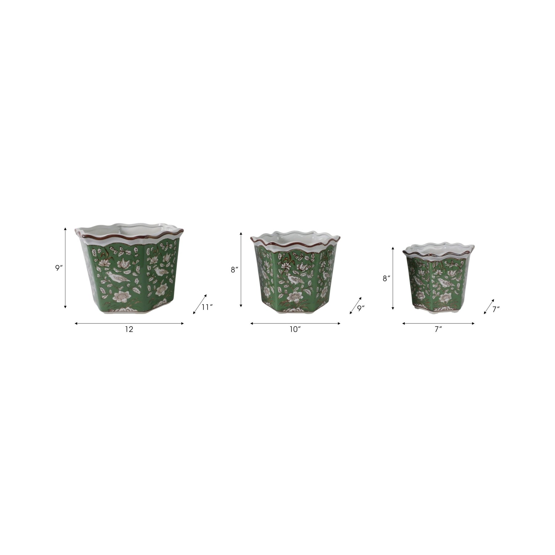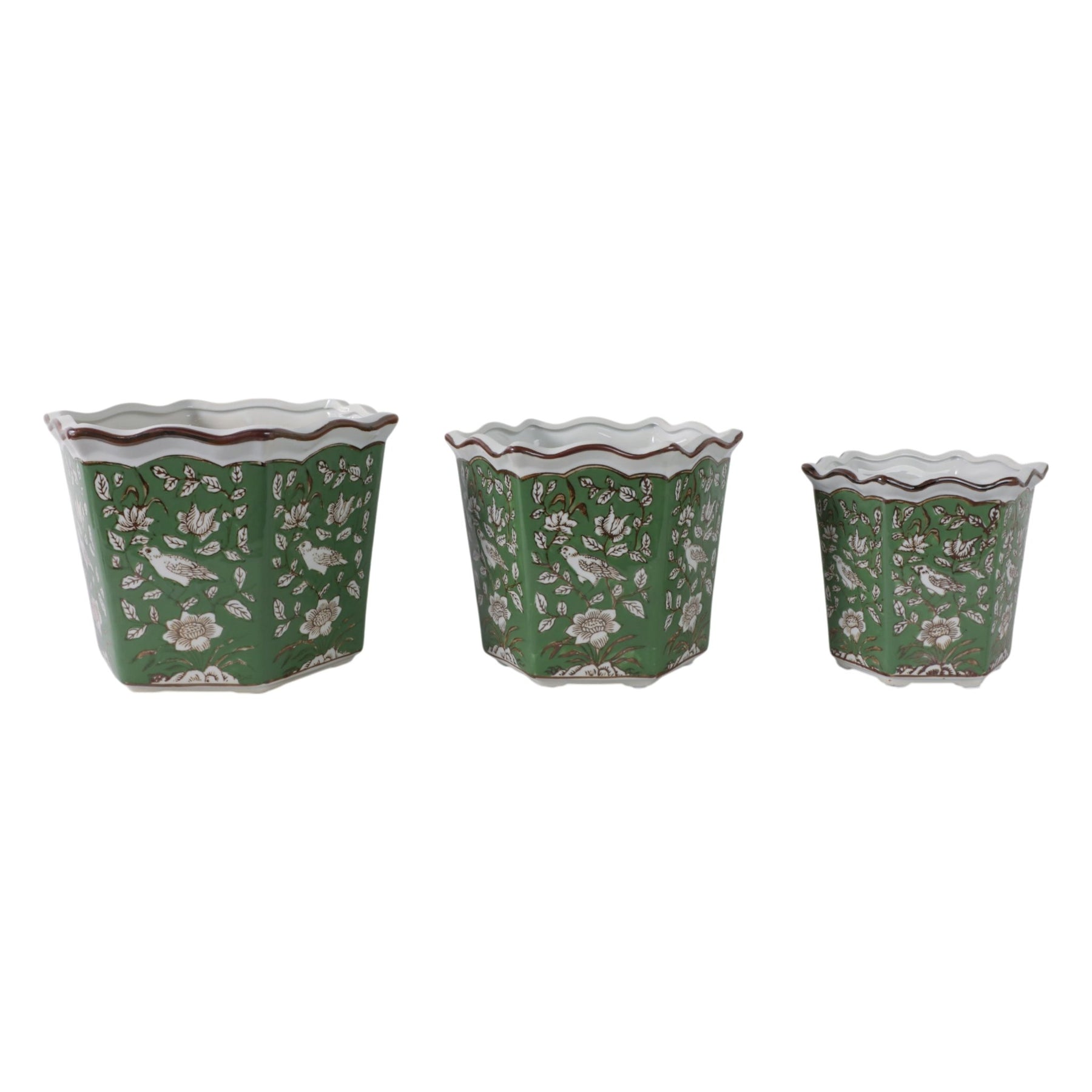 S/3 8/10/12" Chinoiserie Bird Planters, Green/whit