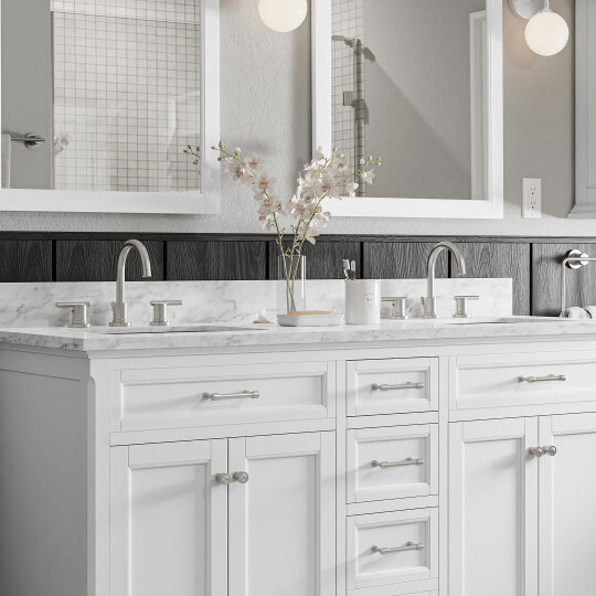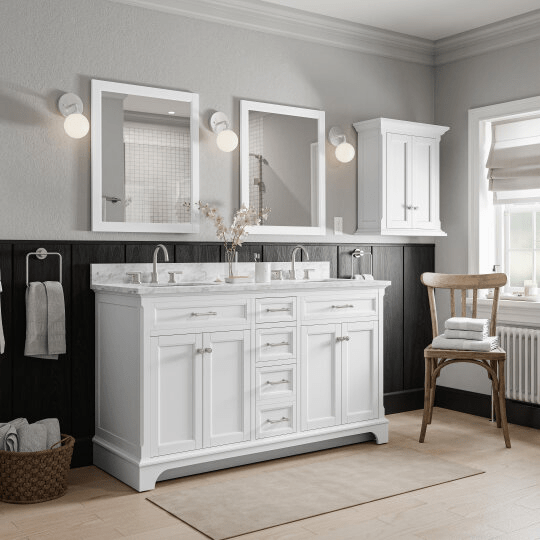 The Roveland 60-inch White Undermount Bathroom Vanity combines sleek design with durable materials for a refined bathroom centerpiece. Featuring a pristine white finish paired with a natural Carrara marble top, it offers both elegance and easy maintenance. The undermount sink design maximizes countertop space while providing a seamless look, ideal for a modern bathroom environment. Its spacious layout accommodates essential storage needs, making it a practical yet sophisticated choice for enhancing your bathroom’s functionality and style.