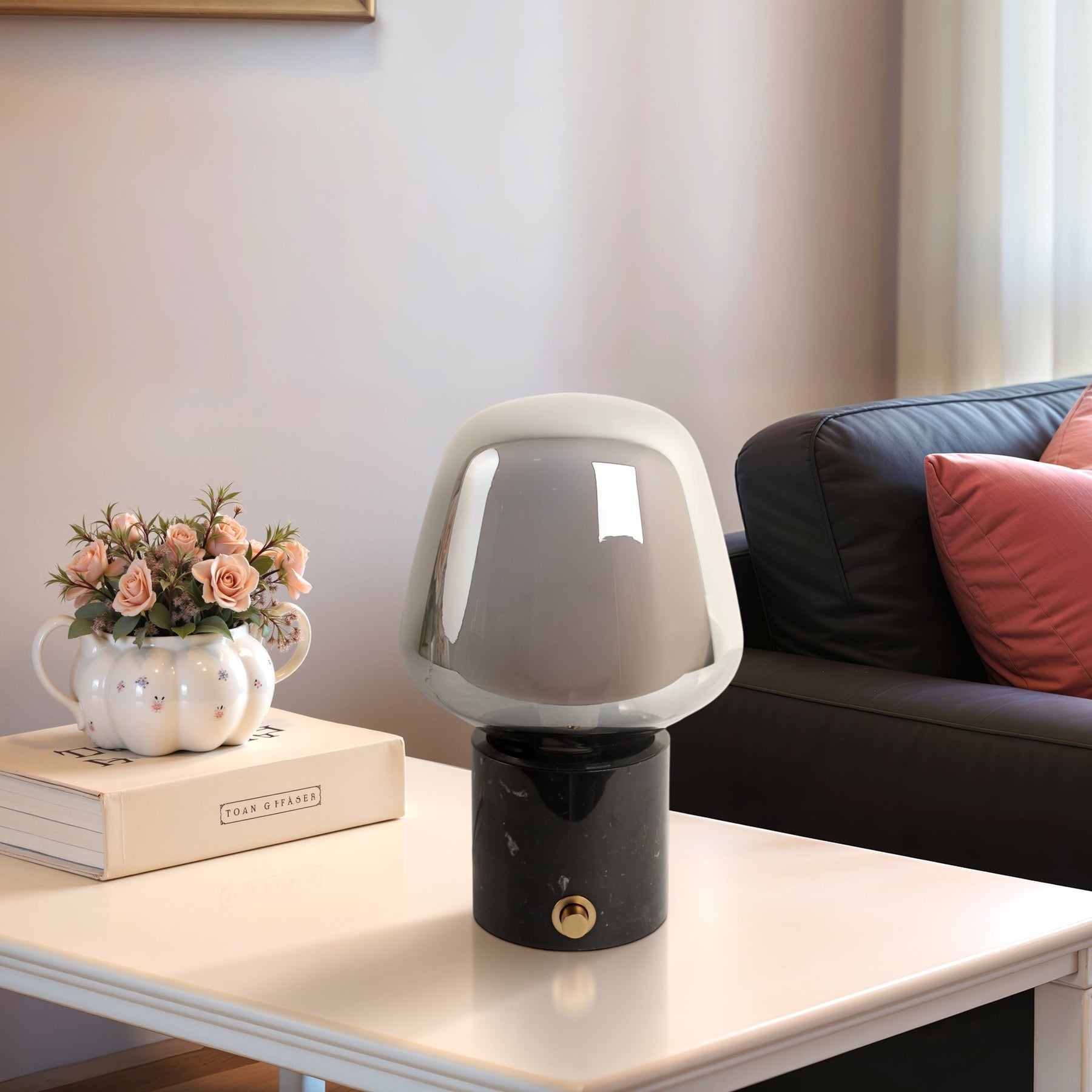 12x8" Glass Shade On Marble Base With Switch, Blac