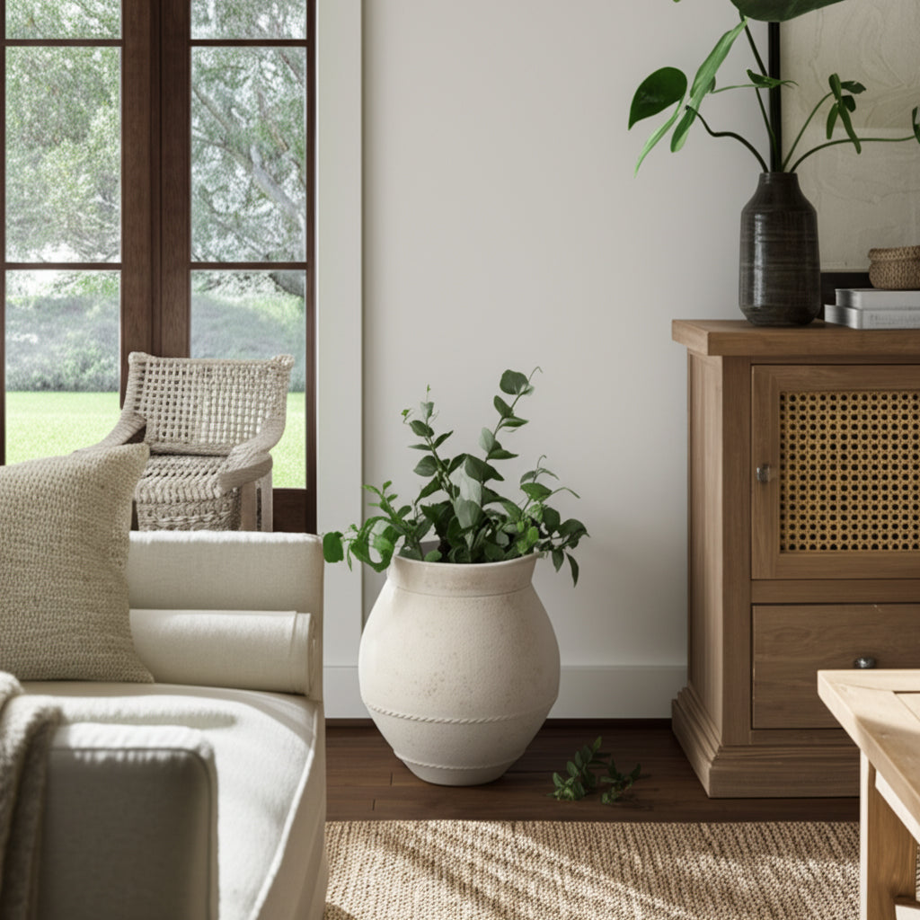المزهرية التقليدية من الطين المحروق بقياسات 20x18 بوصة، عاجي/أسود 20x18 Traditional Terracotta Vase, Ivory/Black