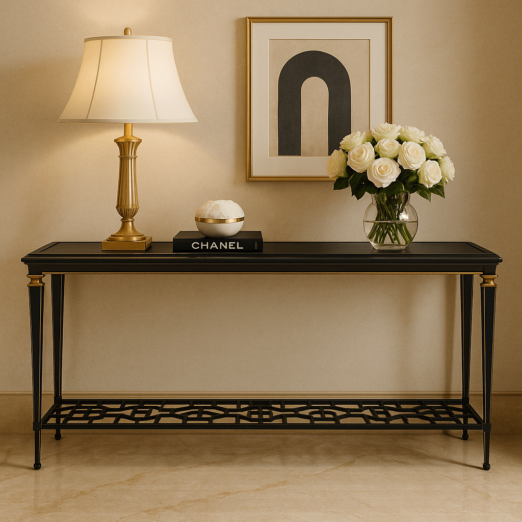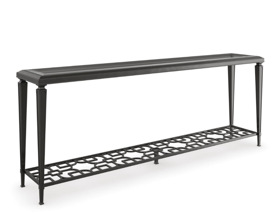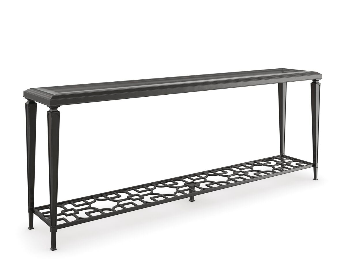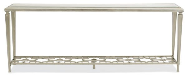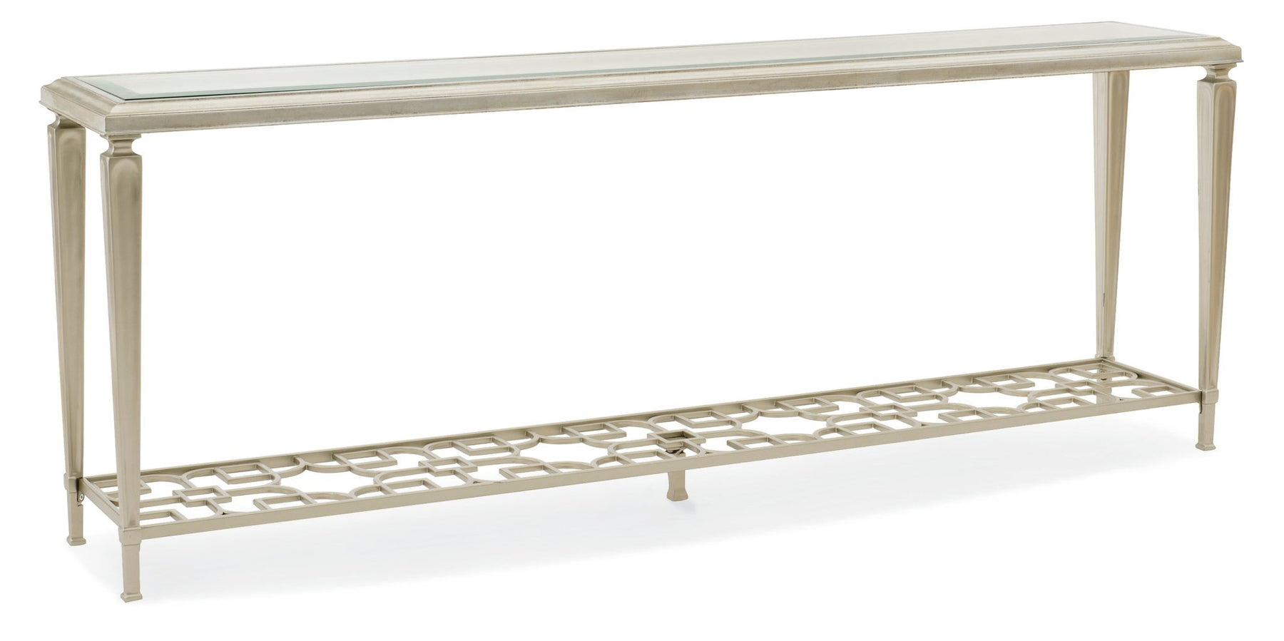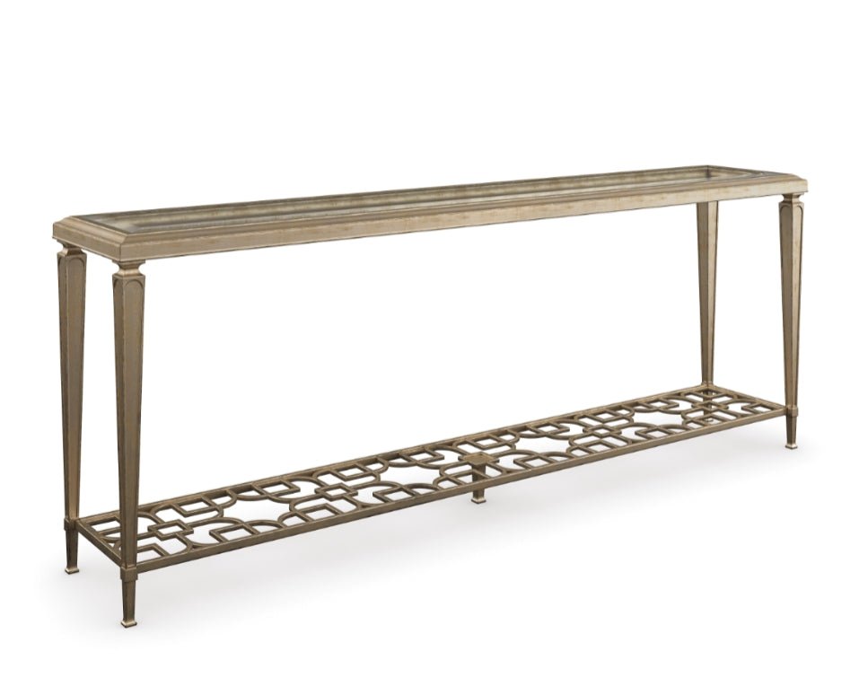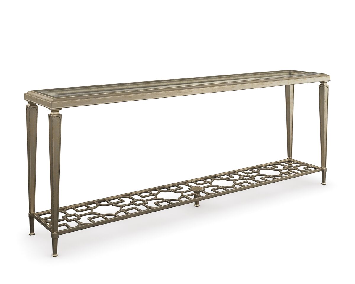 Open and alluring, this distinctive console table makes a bold statement. Its airy design is elegant in its simplicity and features an exquisite metal fret-patterned shelf that can be seen through its glass top. Tall metal legs reach skyward and support its clear glass top with 1 ¼” bevel. Finished in Taupe Paint and Taupe Silver Lear, it’s perfect for behind a sofa or anywhere you need a touch of elegance.