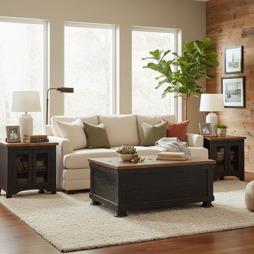 To those with an eye for the best in rustic farmhouse living, this two-tone square coffee table with matching end tables doubles up on form and function. Clever split style design pairs a spring lift top with hinged lid revealing a handy storage compartment. Designer touches include plank-effect styling, distress marks and industrial brackets for added character.