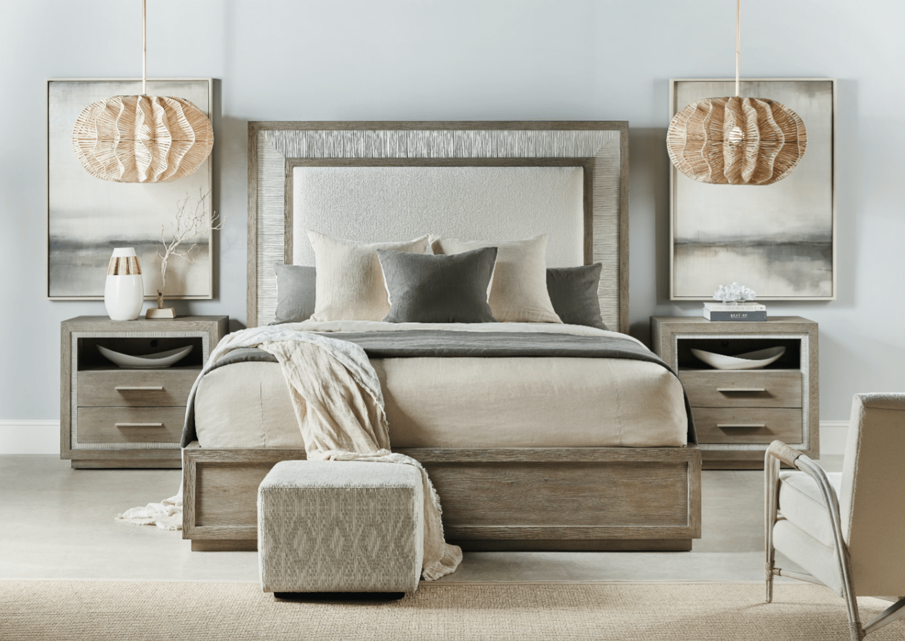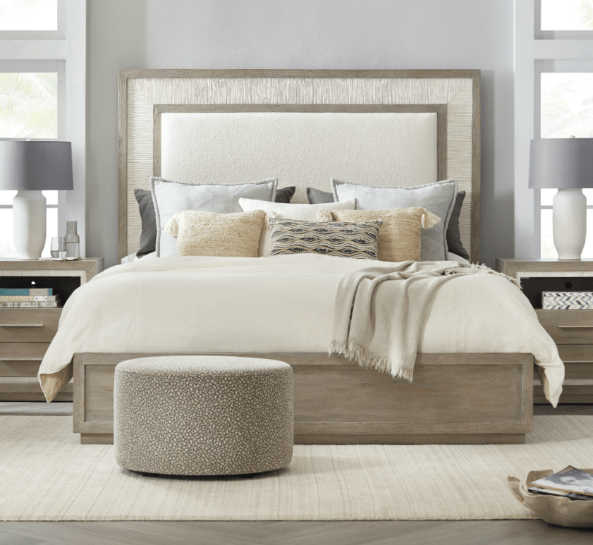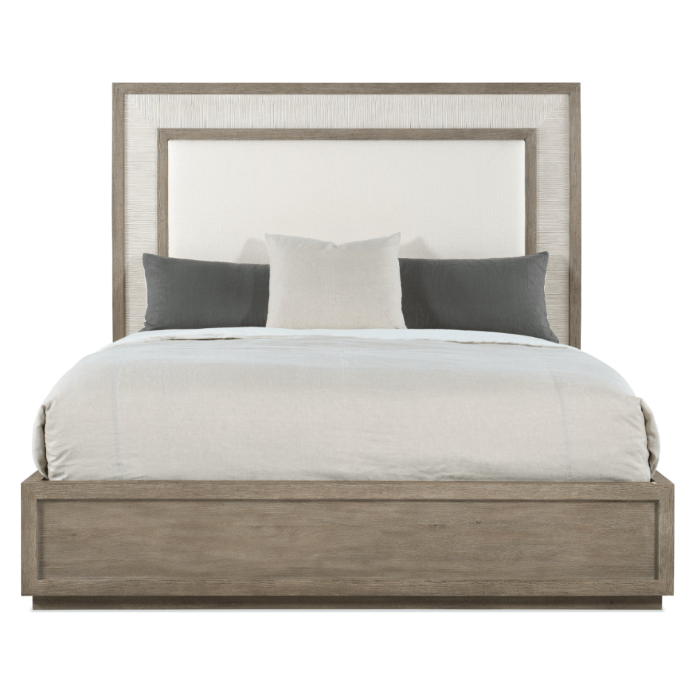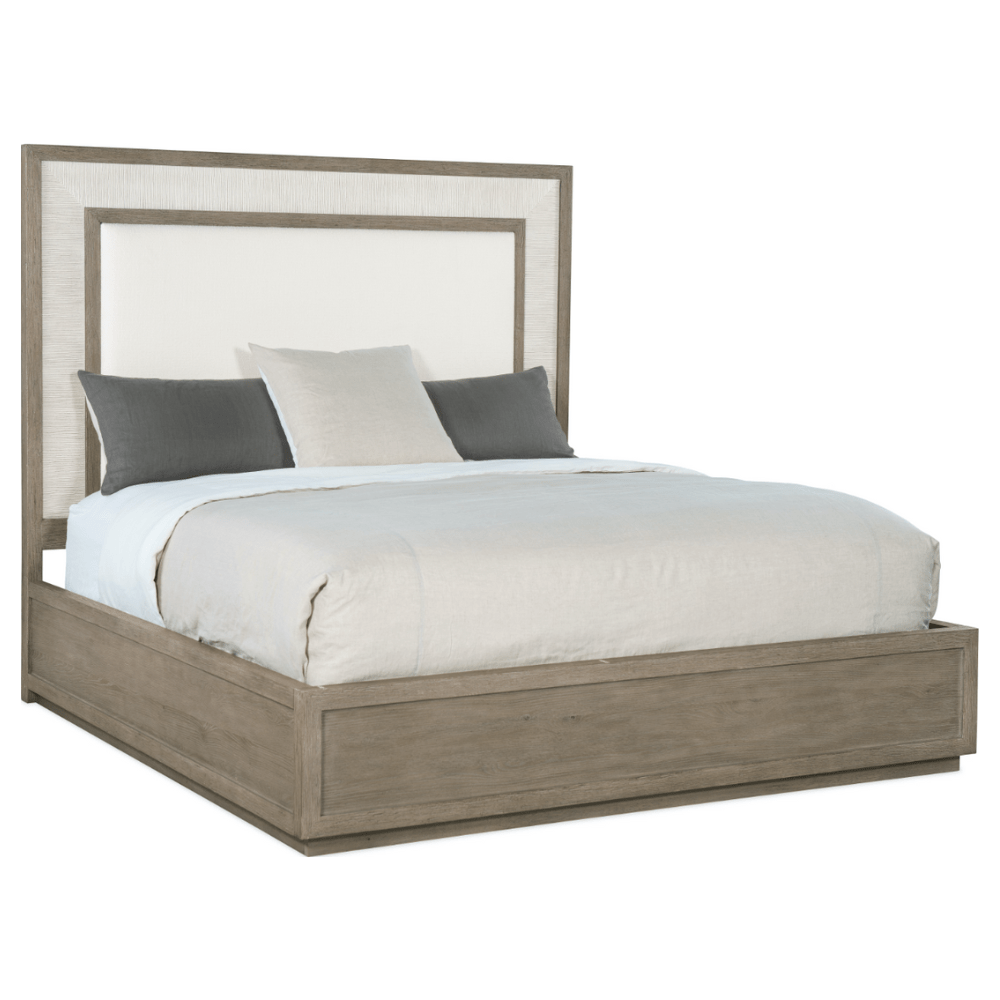 In a crisp two-tone finish combining a gray washed oak with a contrasting textured light gray color, the Serenity Rookery King Upholstered Panel Bed brings the organic tones and textures of cottage waterfront living to your bedroom retreat.