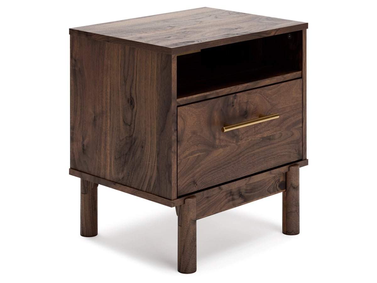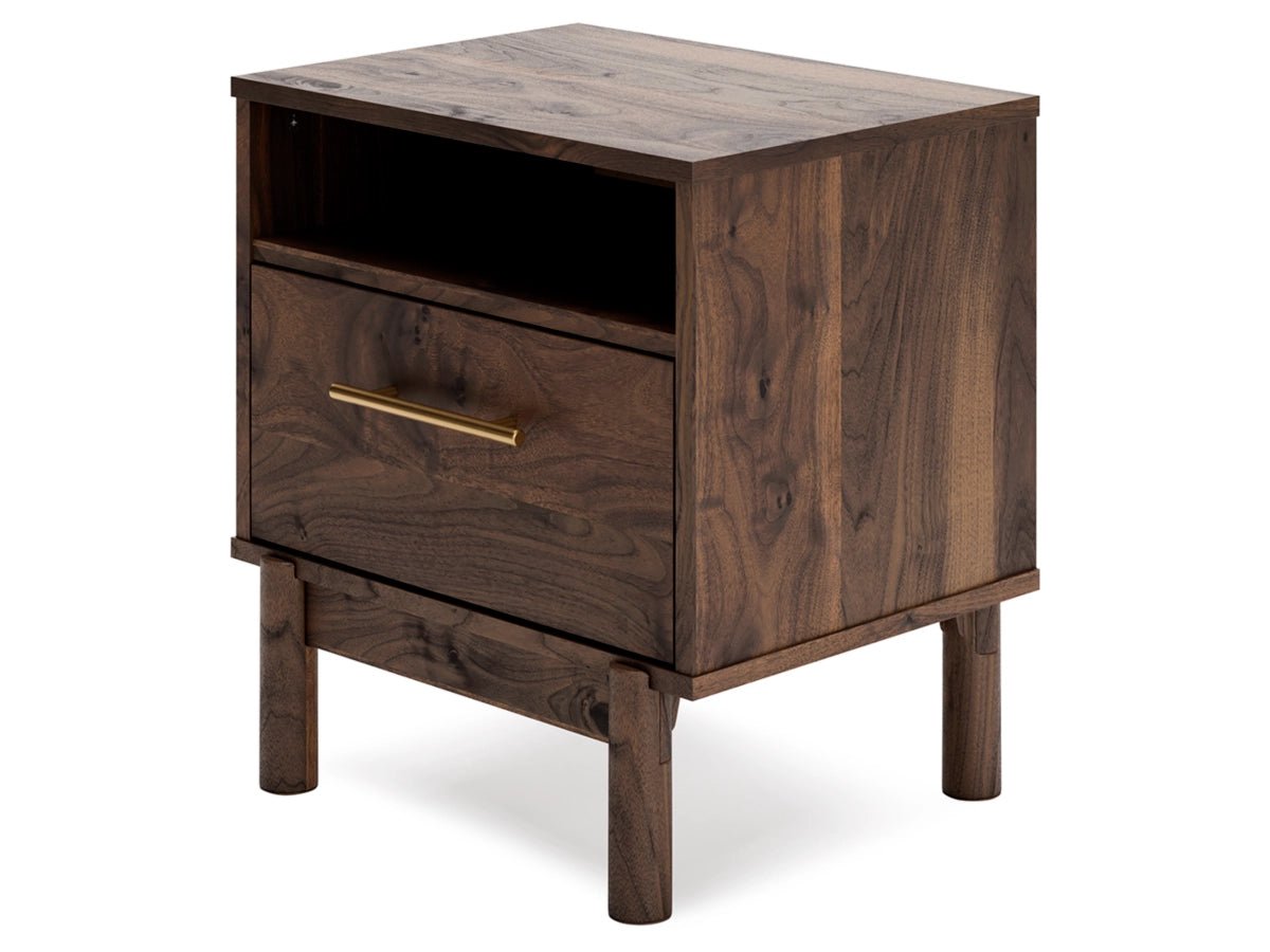 At the intersection of industrial cool and chic sophistication, you’ll find the Calverson nightstand. With a rich brown finish over replicated walnut wood grain, paired with a burnished goldtone handle, it offers an authentic touch that plays well any way you style it. Simple and elegant in its design, this piece keeps your home decor grounded while elevating your modern style.