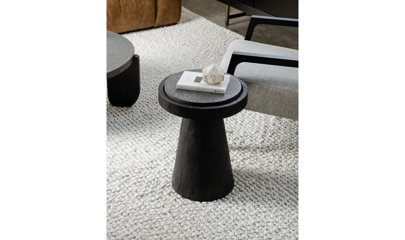 Raw yet refined. The Book accent table is all about the materials, a display of cement and terrazzo combined with a dark and moody color scheme. Its sculpted cement base has a hand-crafted rustic feel, with a silhouette that calls back to antiquity. An optimal plinth for your drinks, trinkets or (naturally) books, the tabletop is made from gorgeously flecked black terrazzo. Perfectly imperfect, the Book accent table will add a bit of tactile flair to any living space.