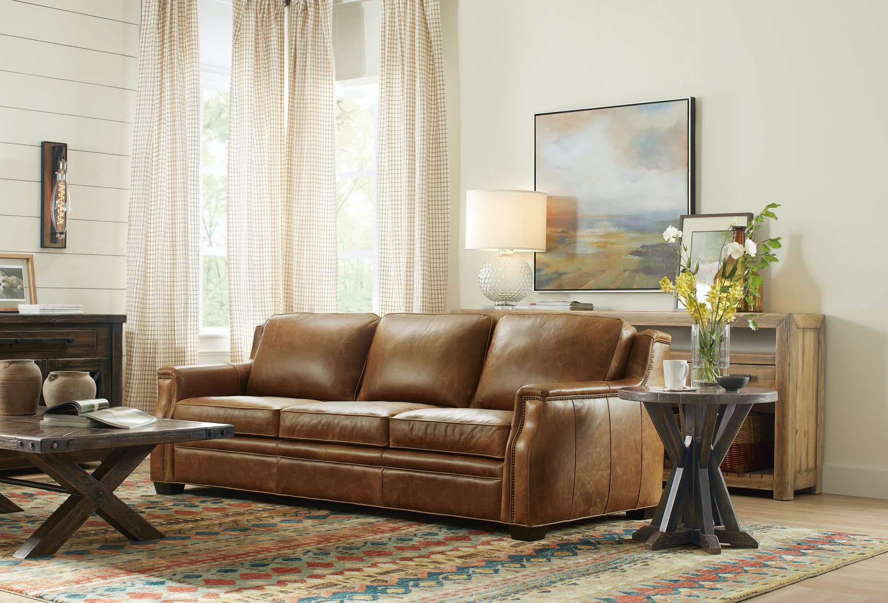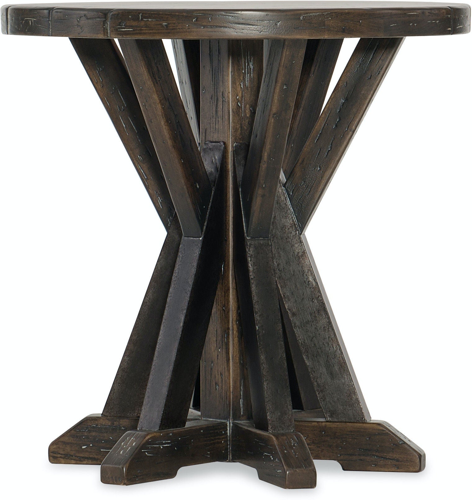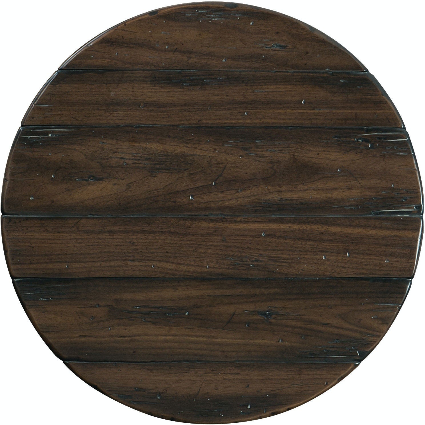 In classic farm-to-decor style, the inviting Roslyn County Round Cocktail Table evokes authenticity with its plank-and-metal-sheeting base reminiscent of trusses in reclaimed barns. The Dark Walnut finish is waxed and smooth to the touch, offering a rustic luxe appeal.