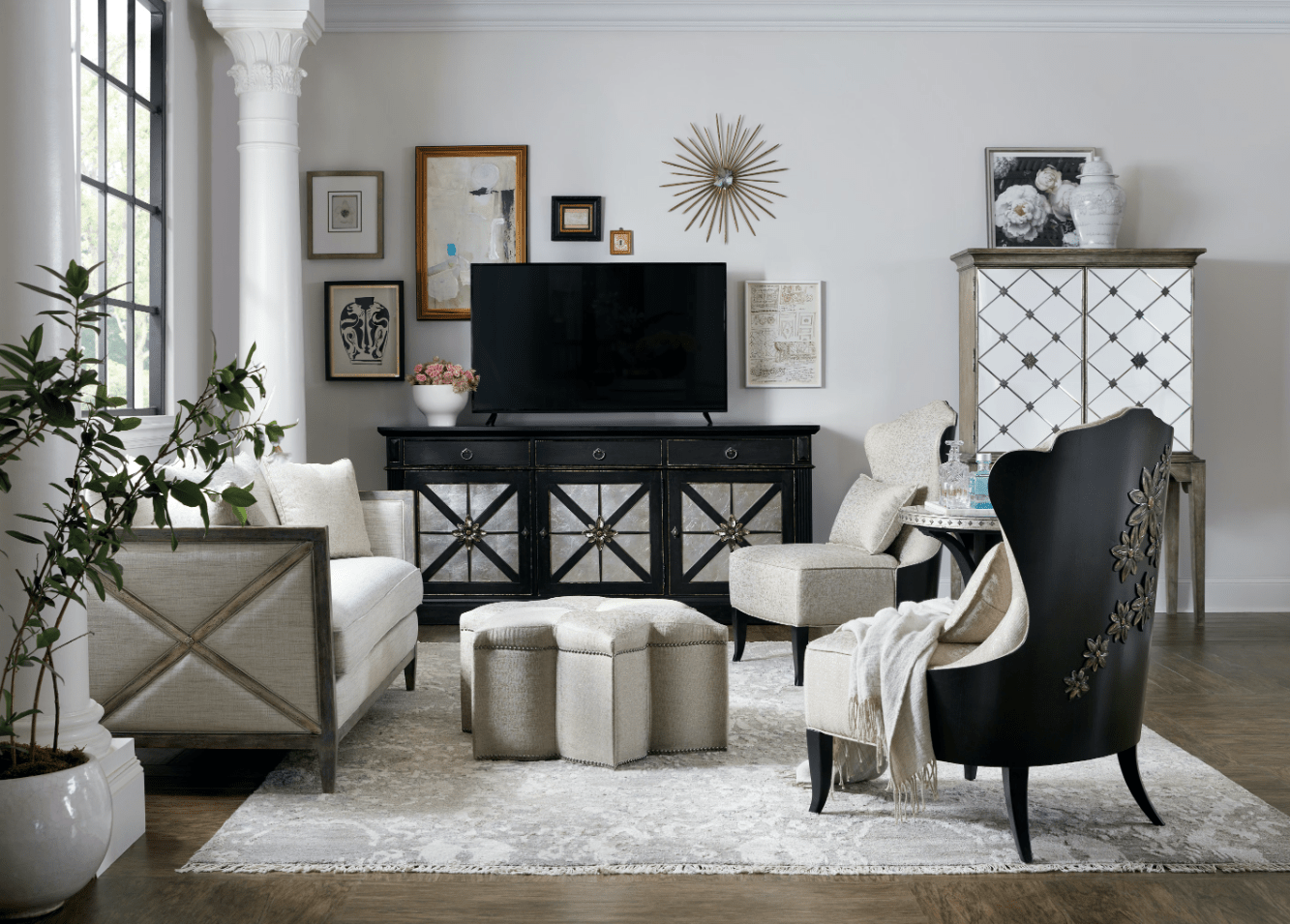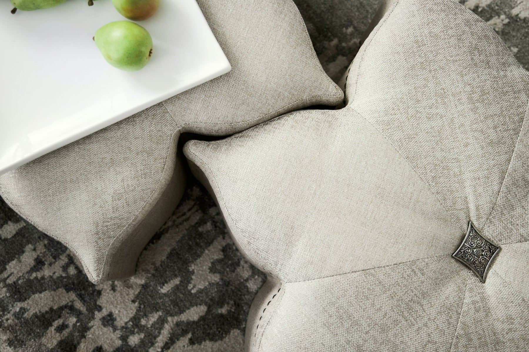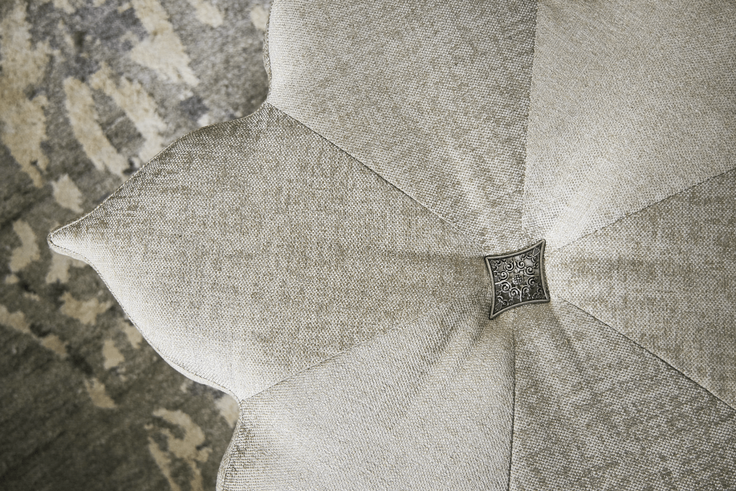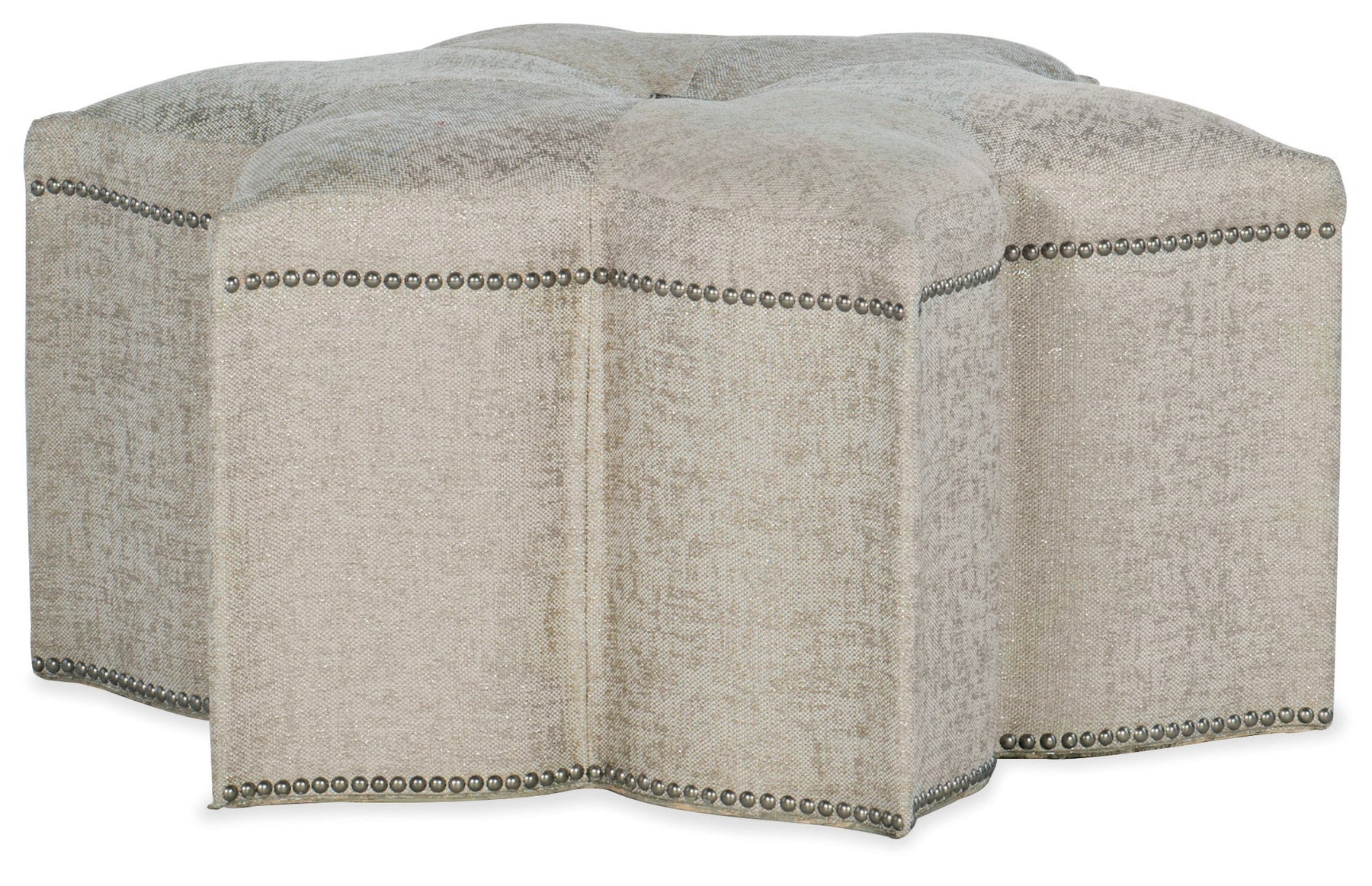 Whimsical and witty and elegant and inviting, the Star of the Show Ottoman has a subtle sparkle that will put a glint in your eyes. Fully upholstered in the luminescent Sequins Pearl performance fabric, delightful details include silver colored nailhead trim and a decorative antique silver medallion on the top center.