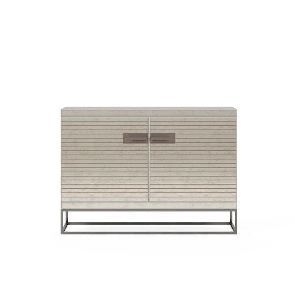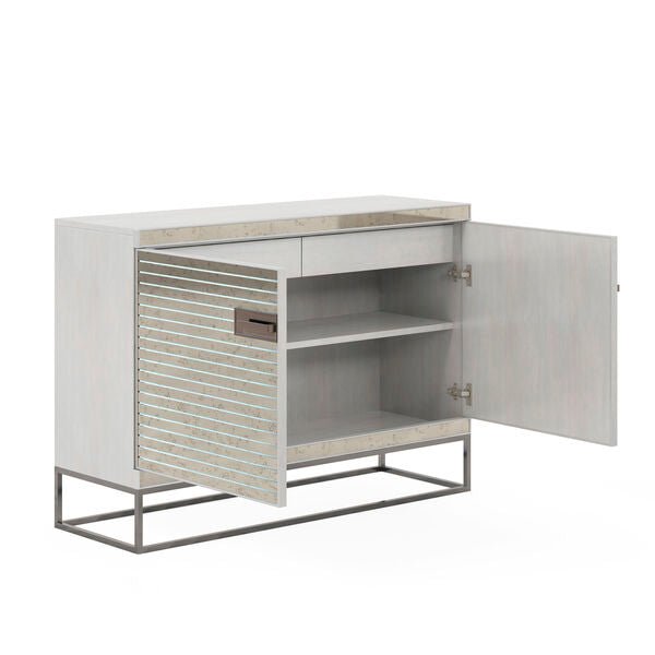 This versatile storage piece features a pair of doors finished in antiqued mirror, with a horizontally grooved pattern that adds texture and intrigue. Inside, two drawers and an adjustable shelf provide space for any room?s essentials, from linens to accessories. Oversized nickel handles and an open metal base add a touch of metallic shine to this modern chest.
