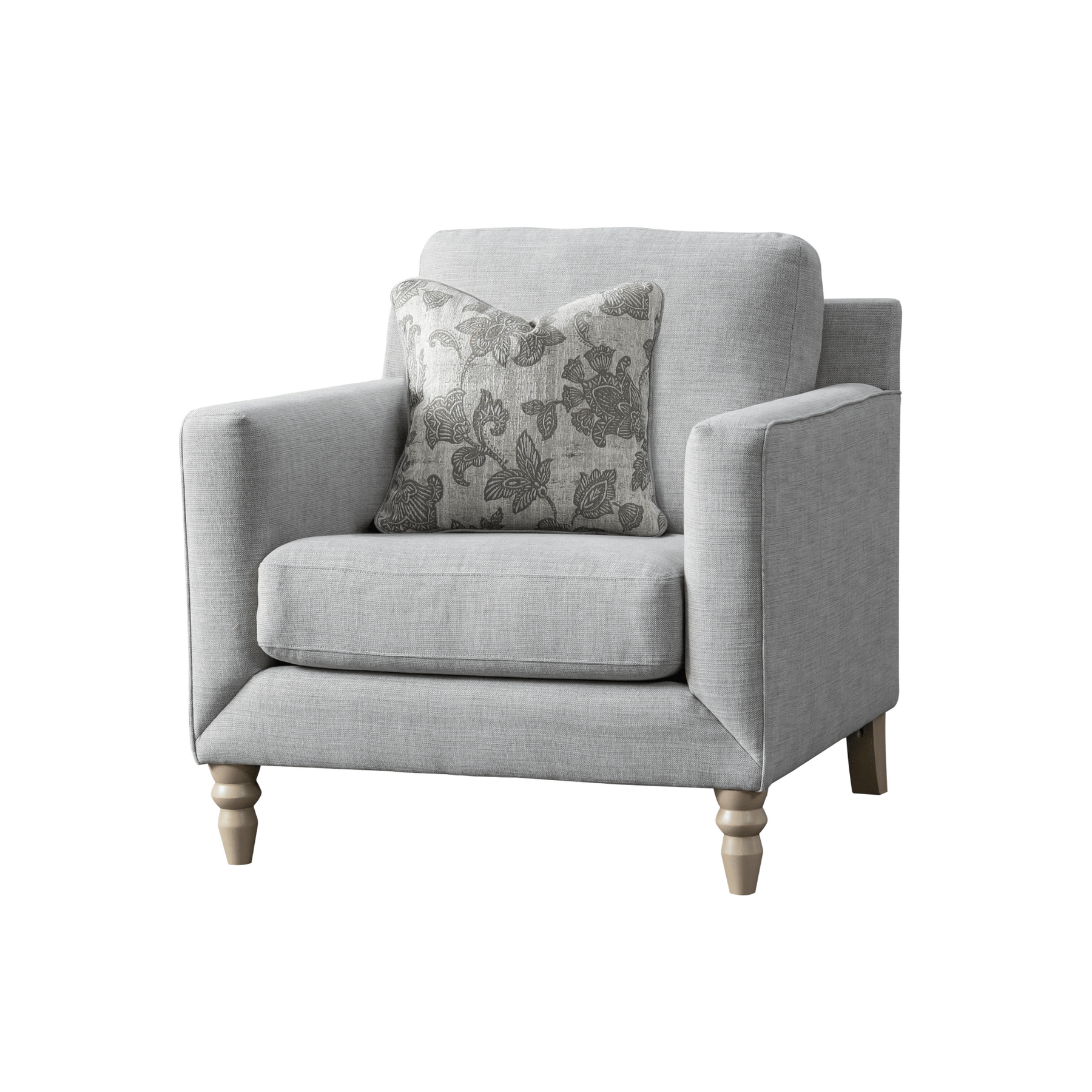 Enjoy spending time with family or friends in this inviting Nostalgia Grey Chair by Roots Furniture. This chic chair is very modern and unique, perfect for impressing while decompressing. With clean lines and stylish patterned pillows, you won't find another piece that combines ideal poshness with perfect softness.
