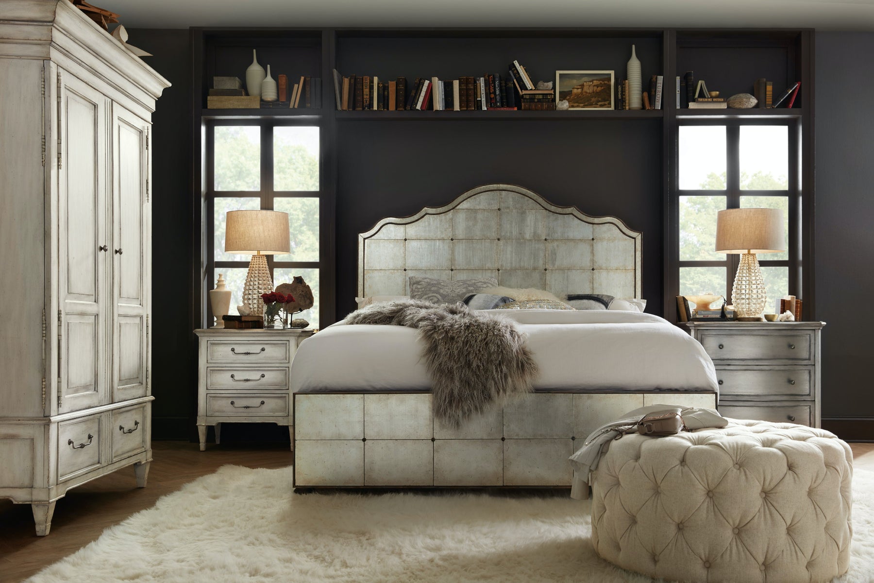 Pretty and packed with practical function, the Arabella Three-Drawer Nightstand will become your favorite home companion. With a white finish on maple veneer with crackle revealing a champagne shimmer underneath and a heavily waxed aluminum top, the top drawer has a drop-in felt liner, and there is one live USB port and three electrical outlets. One touch switch is located on each side of the case, there is a light underneath and a cord clip. The bottom drawer has a cedar bottom.