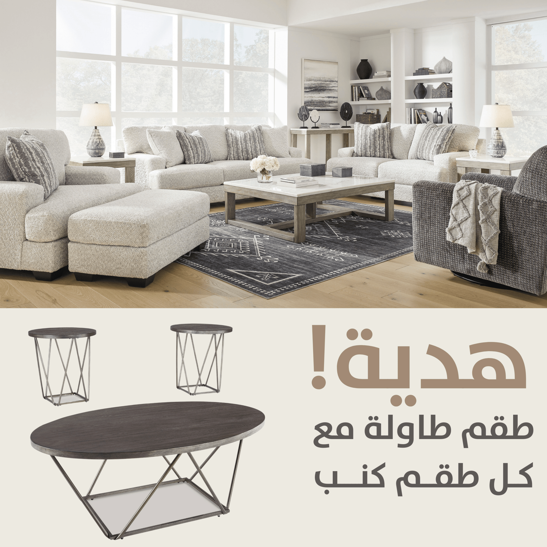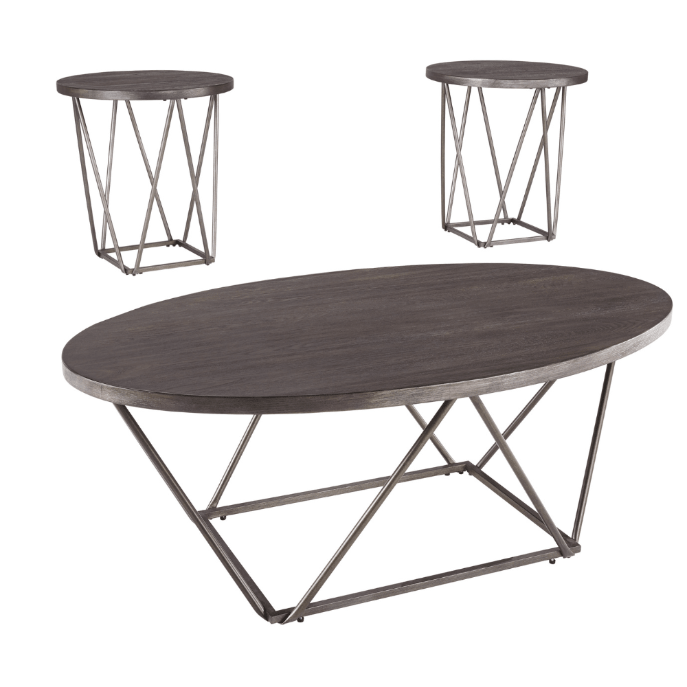 Includes oval cocktail table and 2 round end tables;Made of elm veneers and engineered wood;Textural grayish brown finish;Bridge truss base with thin-line aesthetic