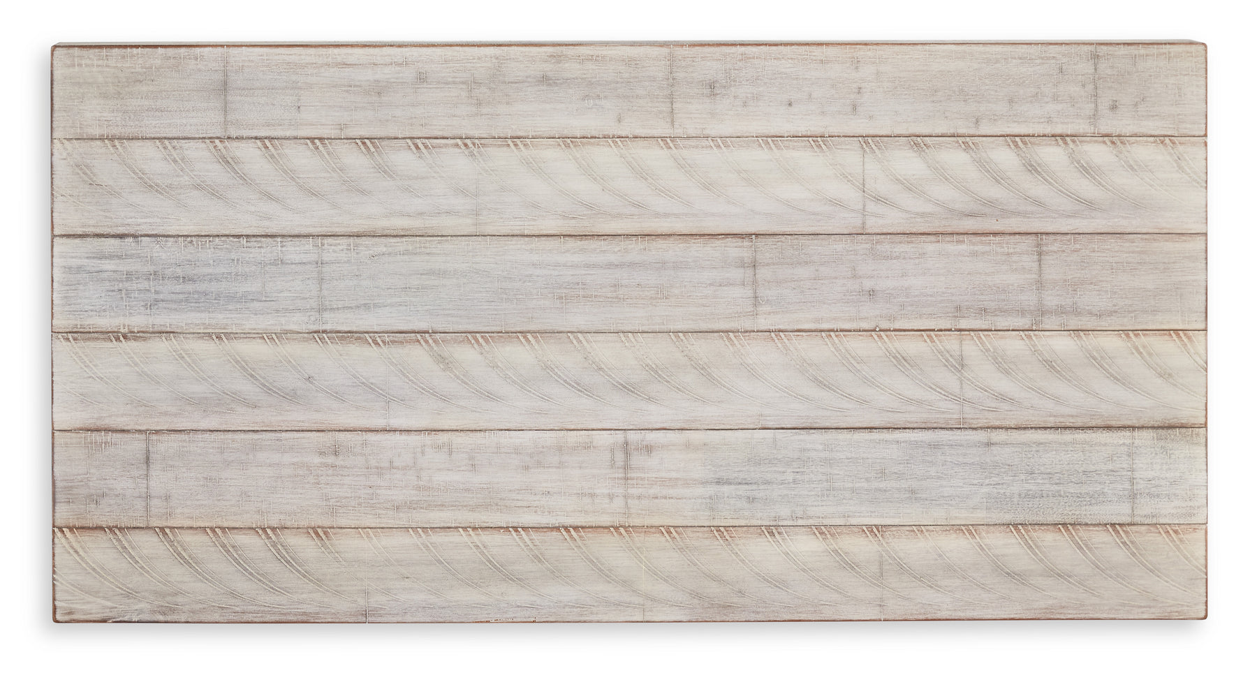 A rustic rendition of modern farmhouse style, the Carynhurst coffee table set is right in tune with your richly relaxed sense of style. The clean yet hearty profile is enhanced with a distressed whitewash finish and offset plank-effect tabletop. Decorative tension bar and nailhead accents add an industrial twist.