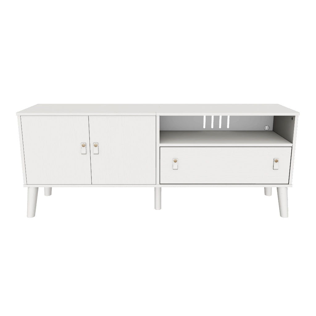 Dare to take minimalism to the max. The Aprilyn TV stand has an air of sleek simplicity thanks to its white painted finish with subtle replicated wood grain. A drawer, open shelf and cabinet provide just the right amount of living room storage, while magnificently mod splay legs compellingly complement the streamlined design. And with two sets of faux leather pulls that allow you to customize the TV stand to suit your space, there's no doubt about it: this contemporary piece is sure to become a classic.