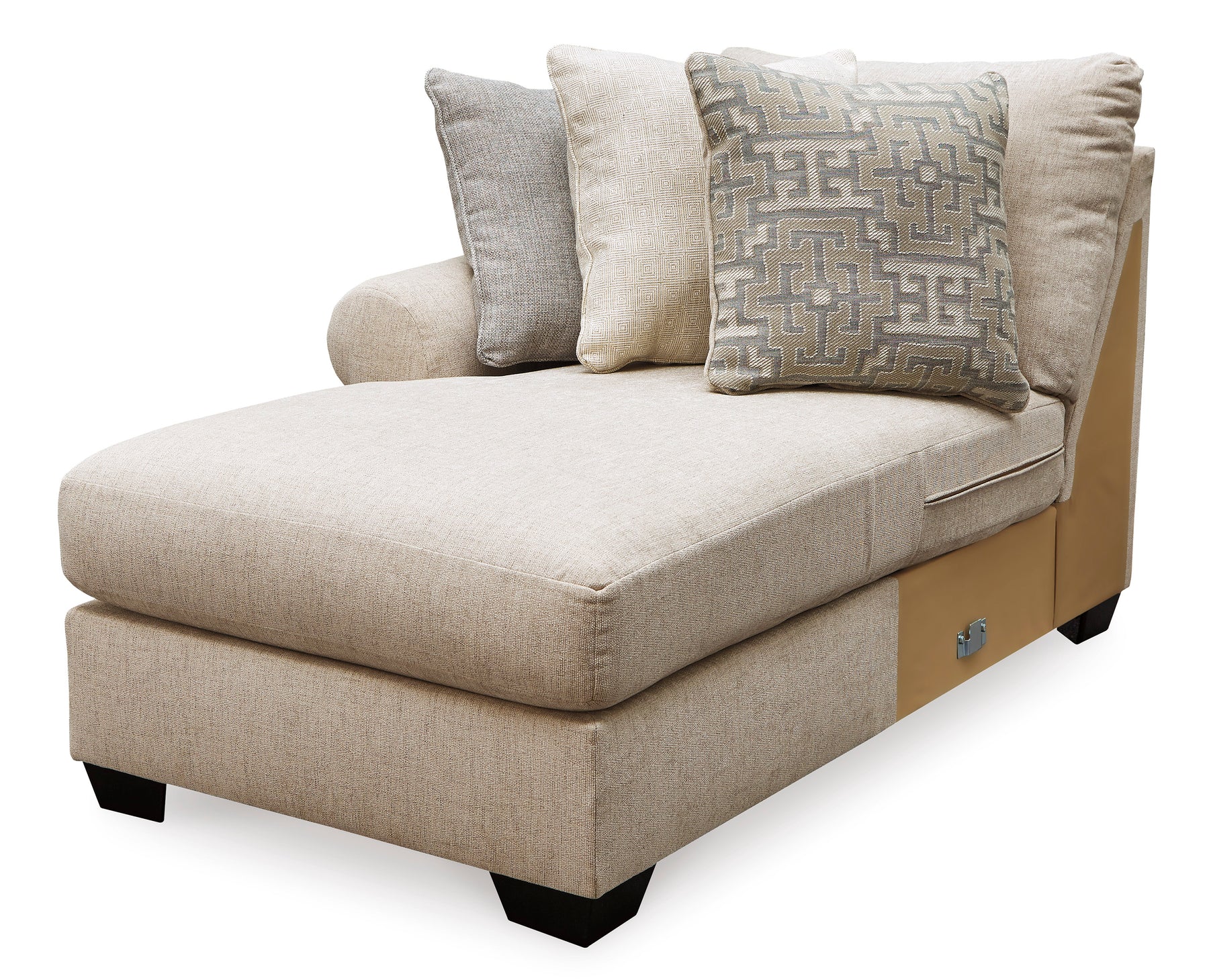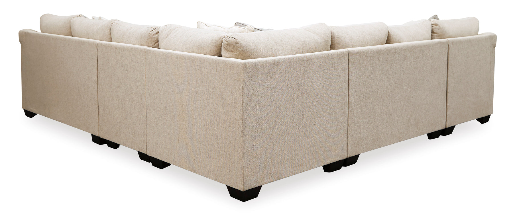 Includes 5 pieces: right-arm facing corner chaise, armless loveseat, armless chair, left-arm facing loveseat and wedge ;"Left-arm" and "right-arm" describe the position of the arm when you face the piece;Corner-blocked frame;Loose cushions ;High-resiliency reversible foam cushions wrapped in thick poly fiber;Polyester upholstery ;Throw pillows included;Pillows with soft polyfill;Exposed feet with faux wood finish;Platform foundation system resists sagging 3x better than spring system after 20,000 testing cycles by providing more even support;Smooth platform foundation maintains tight, wrinkle-free look without dips or sags that can occur over time with sinuous spring foundations