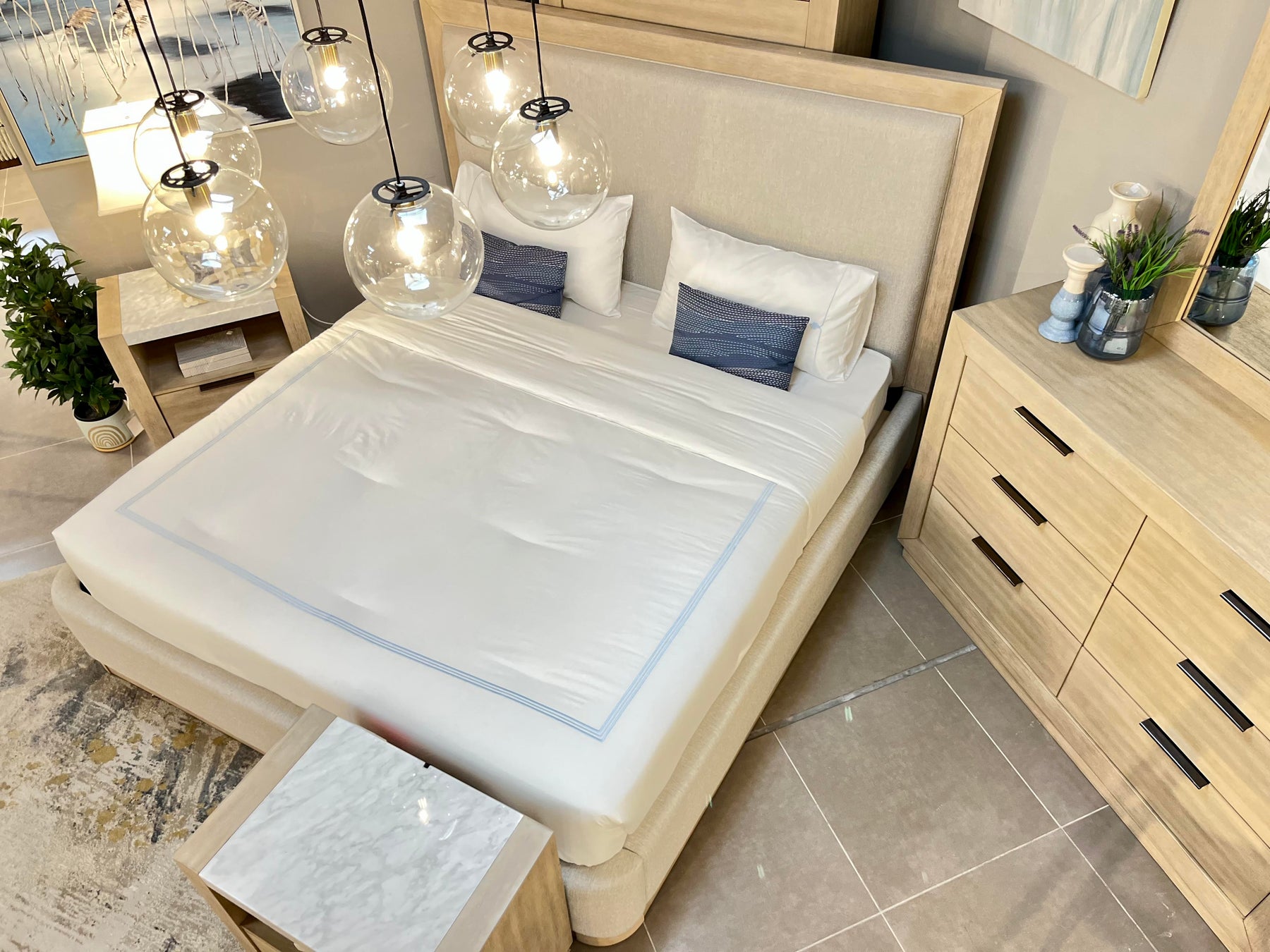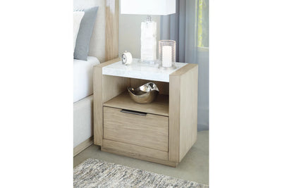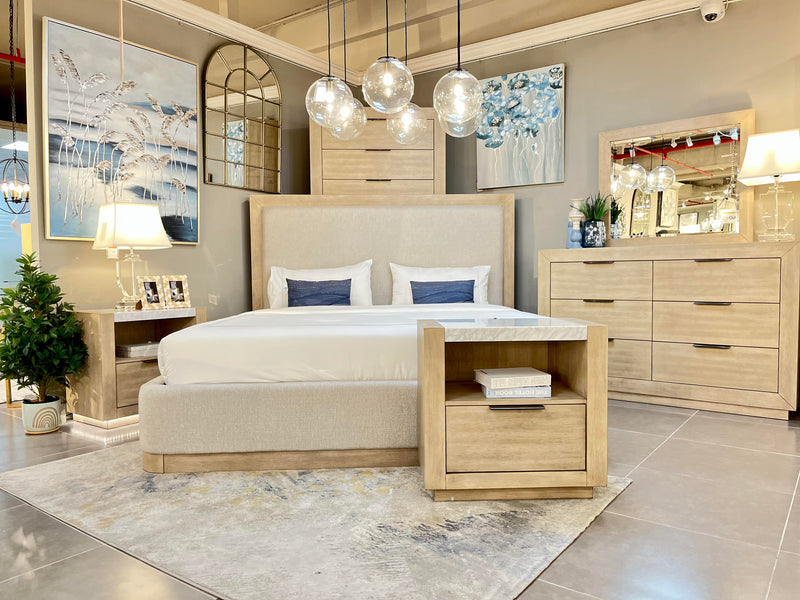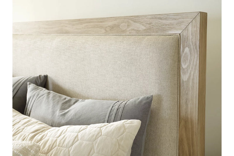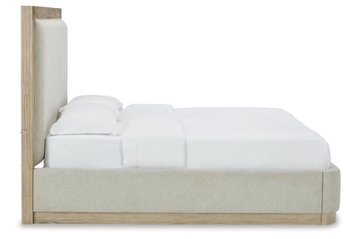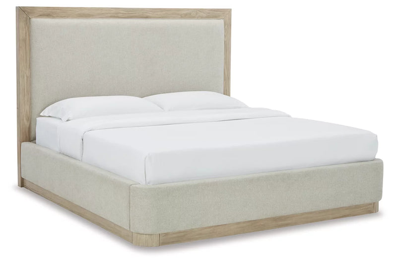 Get the luxe modern contemporary design you love at an affordable price. The Hennington king upholstered panel bed features a structured silhouette on a plinth base that elevates the piece to a modern masterpiece. Soft yet still sleek in design, this bed's side rails and footboard are cushioned and have rounded ends. The textural surface of the bisque-colored wood pairs beautifully with the neutral upholstery.