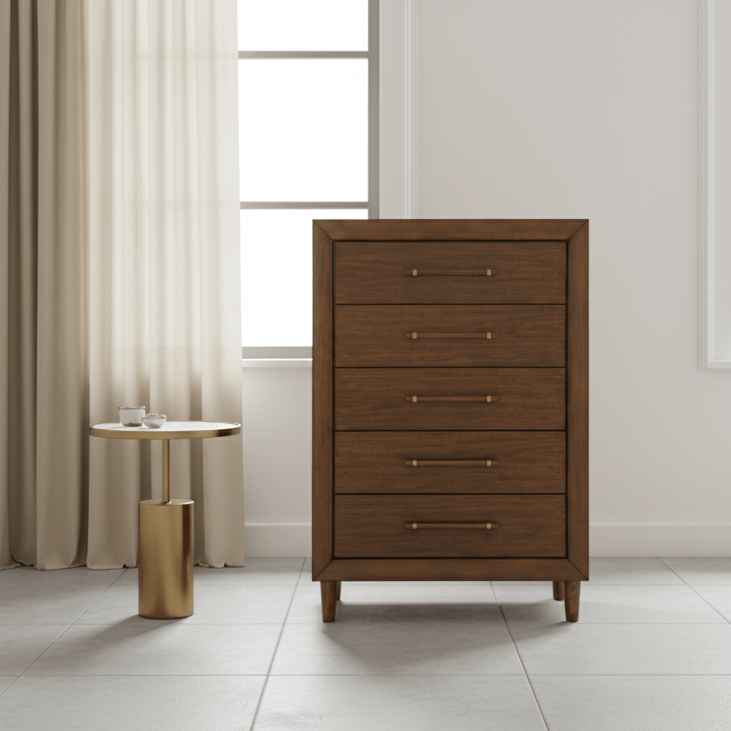 The Lyncott chest of drawers is perfect for contemporary or mid-century interiors. Its wood-tone finish is versatile and timeless. The drawers, designed with exquisite framing and elongated wooden pulls, enhance the overall aesthetic. Whether you want to refresh your entire bedroom or add a few key pieces, this is the ideal choice.