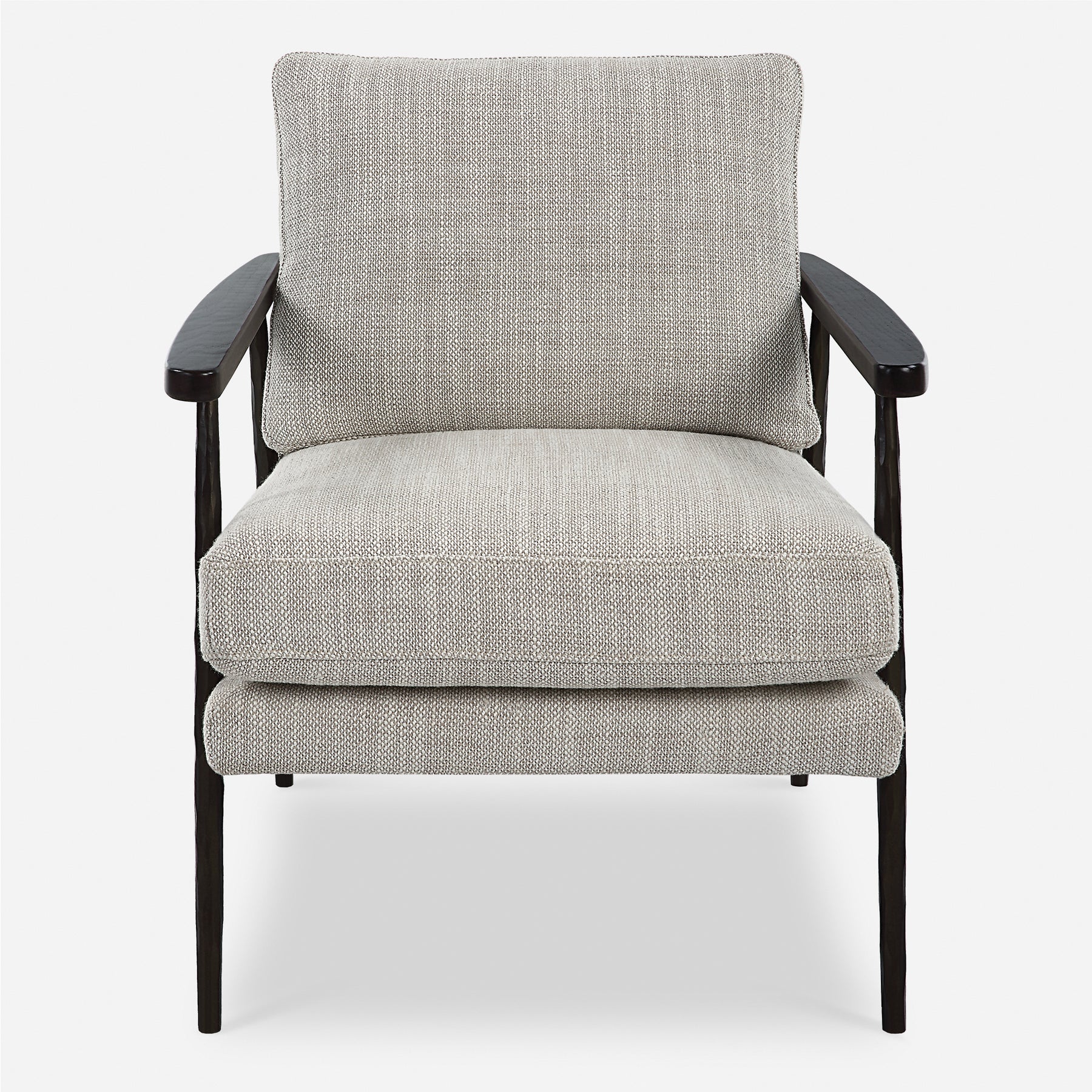 A modern mix of materials with hints of masculinity, this accent chair features a textured cast iron frame in dark bronze with dark walnut finished solid oak arms. Tailored in a neutral polyester weave in ivory and beige tones. Seat height is 18".