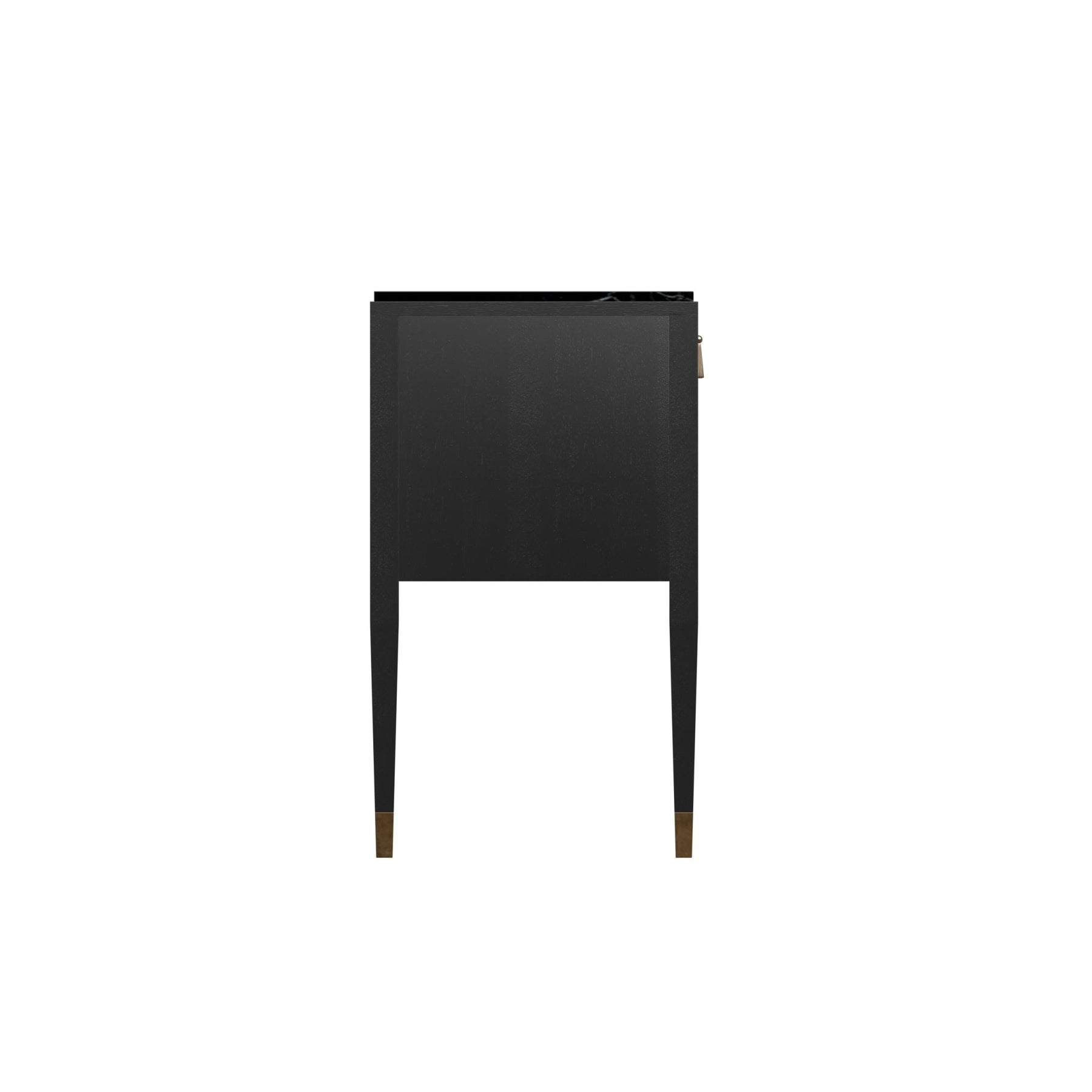 New Traditional Sideboard in Ebony Black (Ink) Finish with four pleated front doors and stylized tassel pulls in Burnished Gold Finish with Black Mariquine Marble Top. Materials Poplar and Parawood Solids,, Black Marquine Marble Dimensions (cm)w-184.15 x d-50.80 x h-87.63