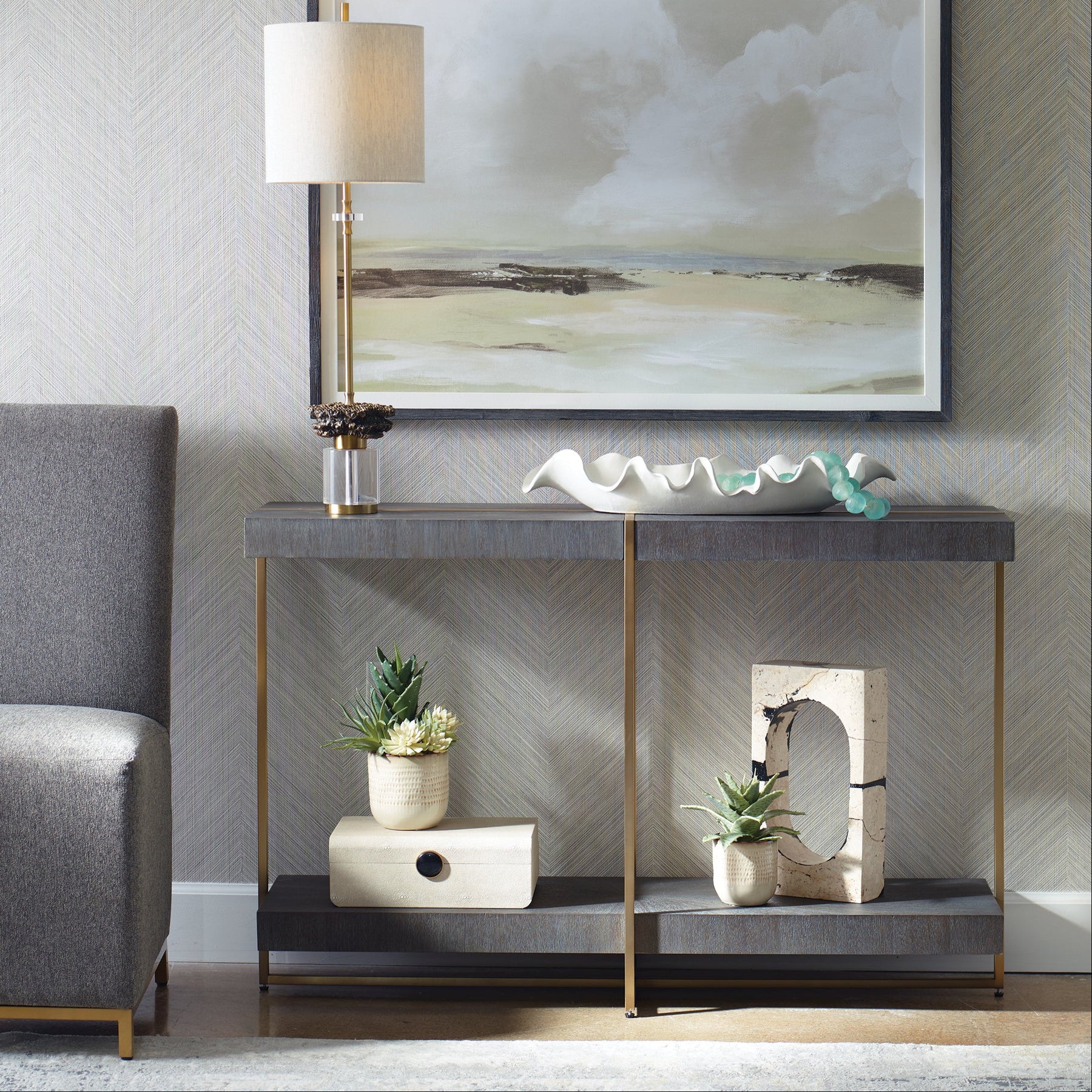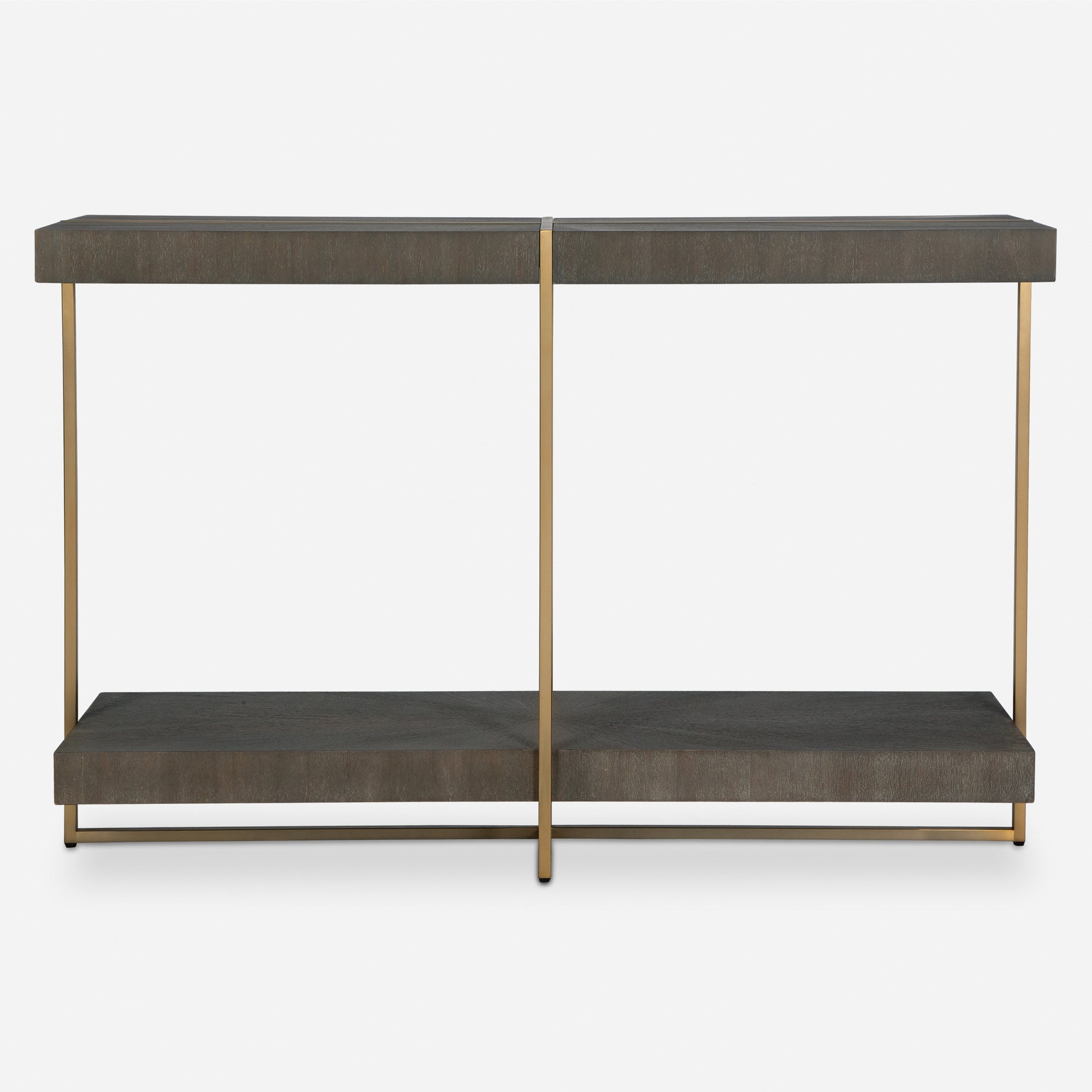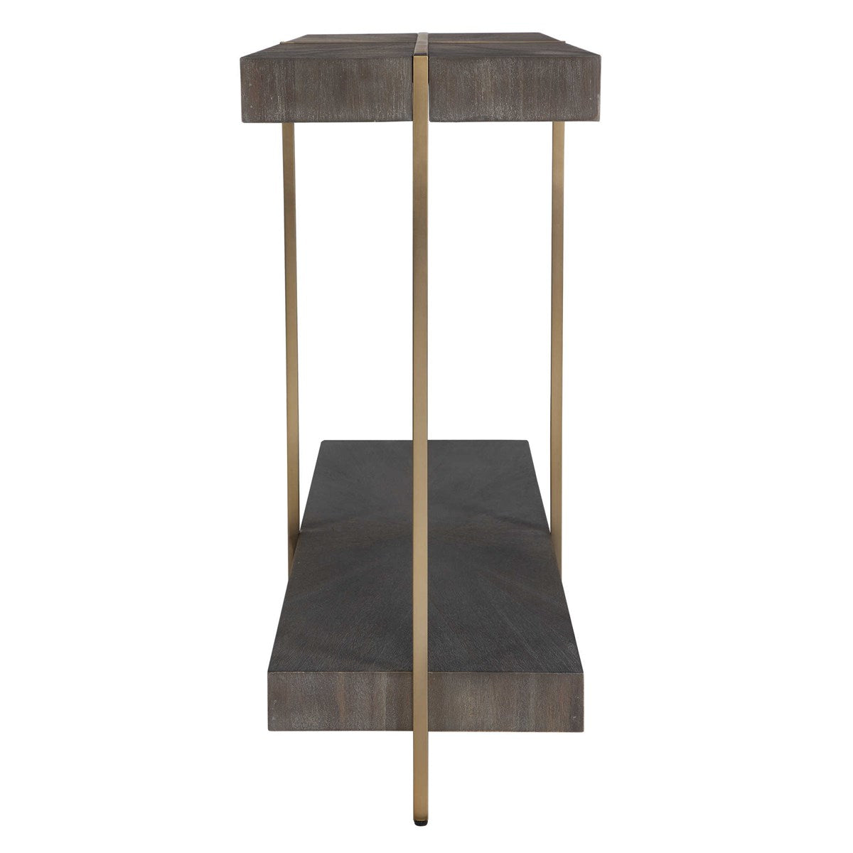 Contemporary in style, this console table features a stainless steel framework finished in a brushed brass with a starburst acacia veneer top in a dark walnut stain washed with a light gray glaze.