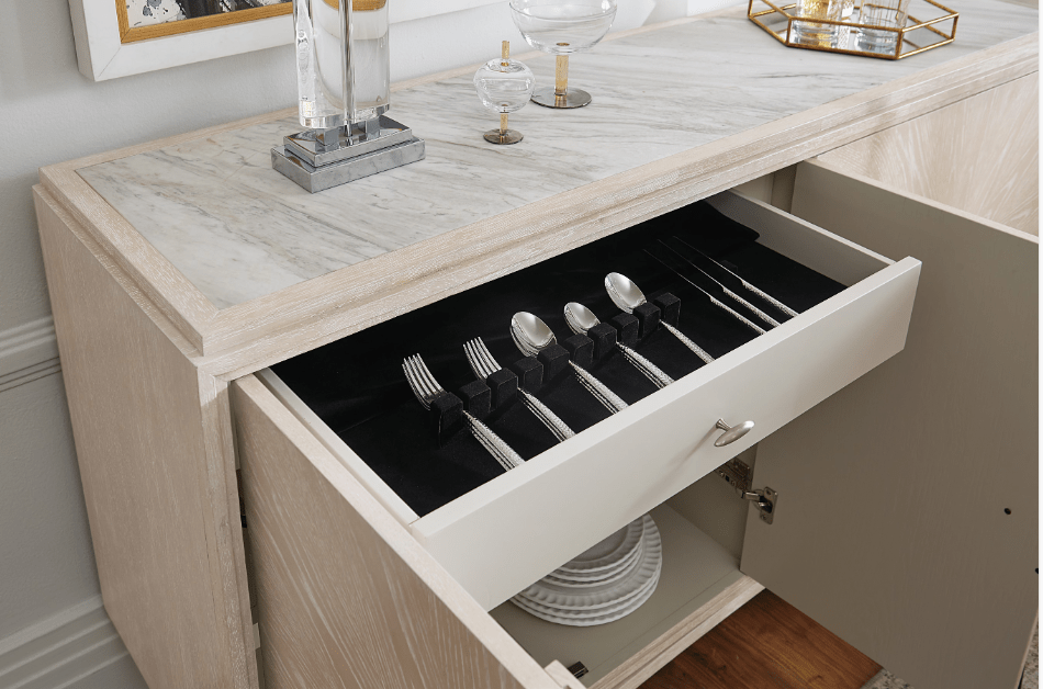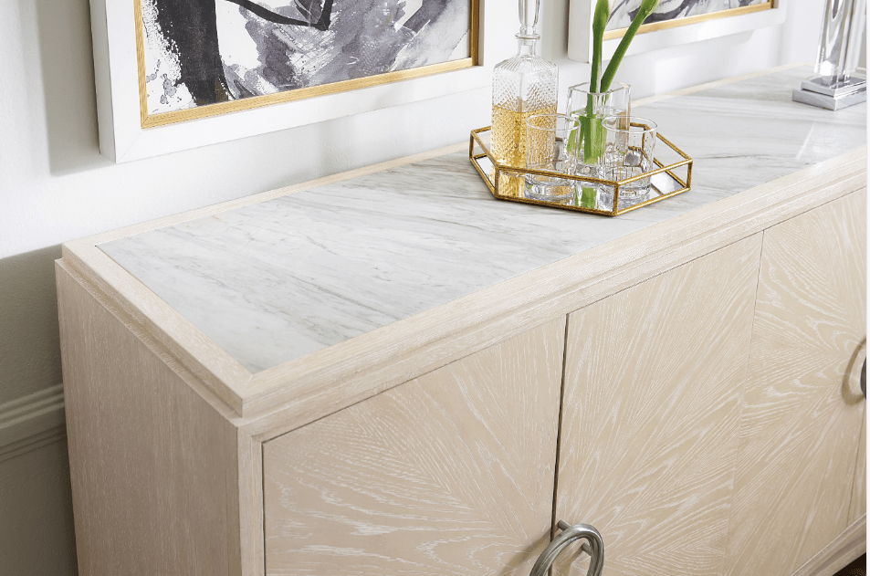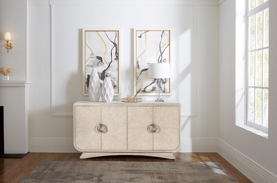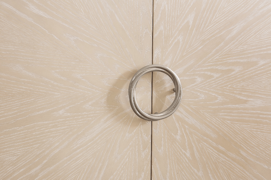 The Nouveau Chic Collection is a casual modern group drawing inspiration from the curvaceous yet uncomplicated designs that are popular today. Nouveau Chic unites classic architectural elements like cathedral and quartered oak, movement of soft shapes, metallicized shagreen, and polished metal accents to create a dramatic yet easy modern aesthetic.