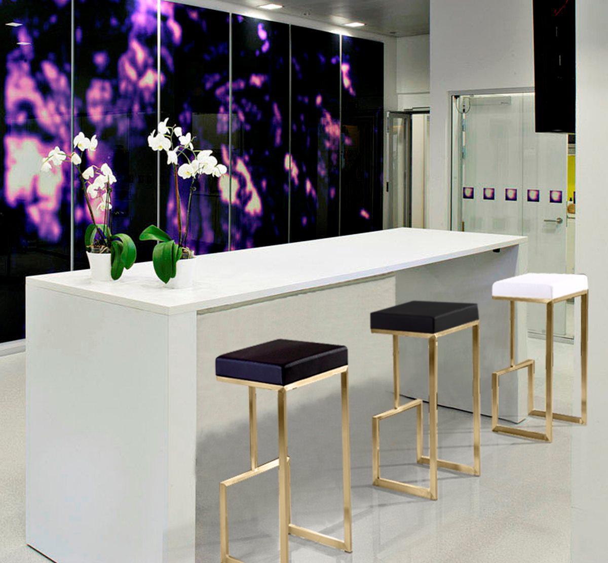 Furnish your kitchen or bar area in contemporary style with the Ferrara barstool. The gold solid stainless steel frame provides a sturdy base, while the plush seat and footrest ensure maximum comfort. The combination of angles and gentle curves gives this stool an eye-catching appearance, while the neutral color allows it to match well with any decor.