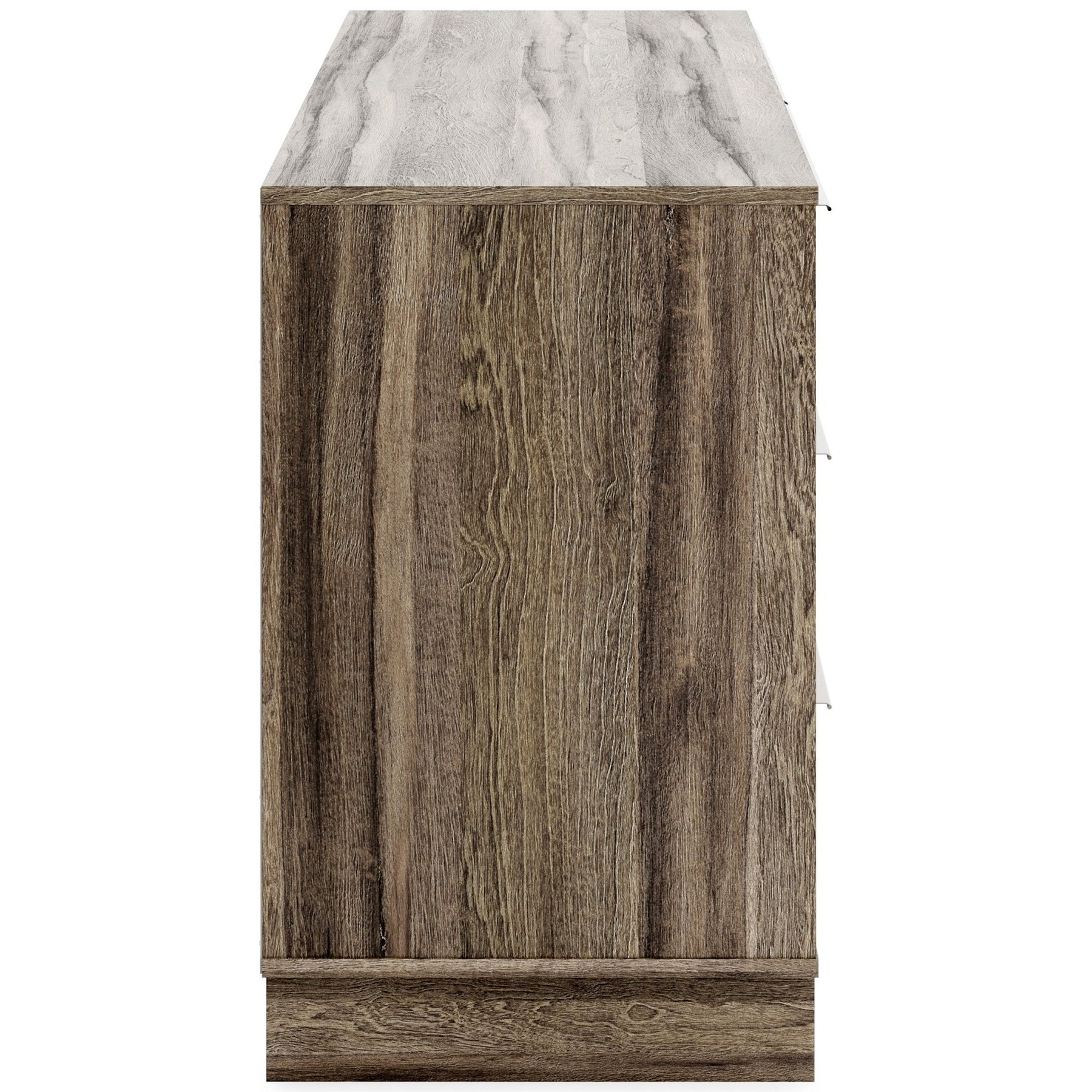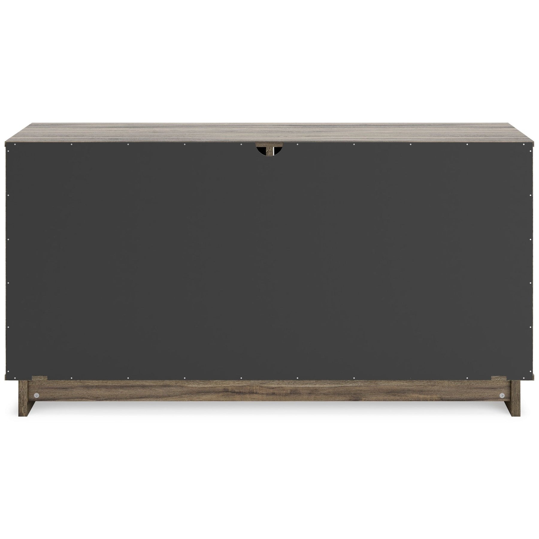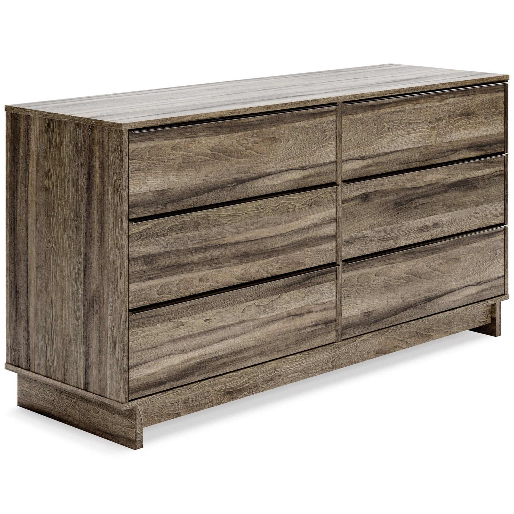 Your modern sanctuary is within reach. The subtle design of this dresser is accented with a low profile base. Its weathered brown finish is complemented with refined champagne-colored handles on the six smooth-gliding drawers.