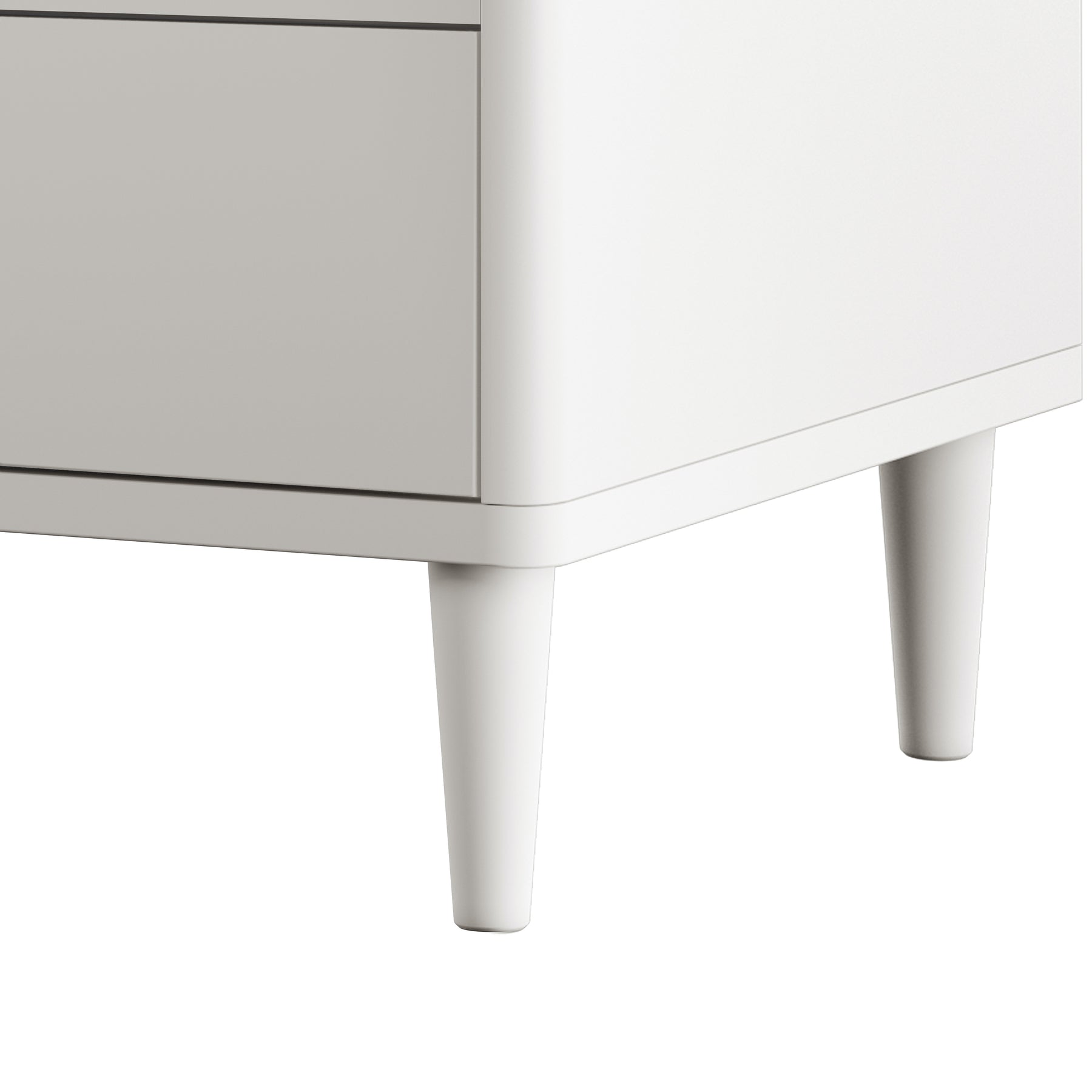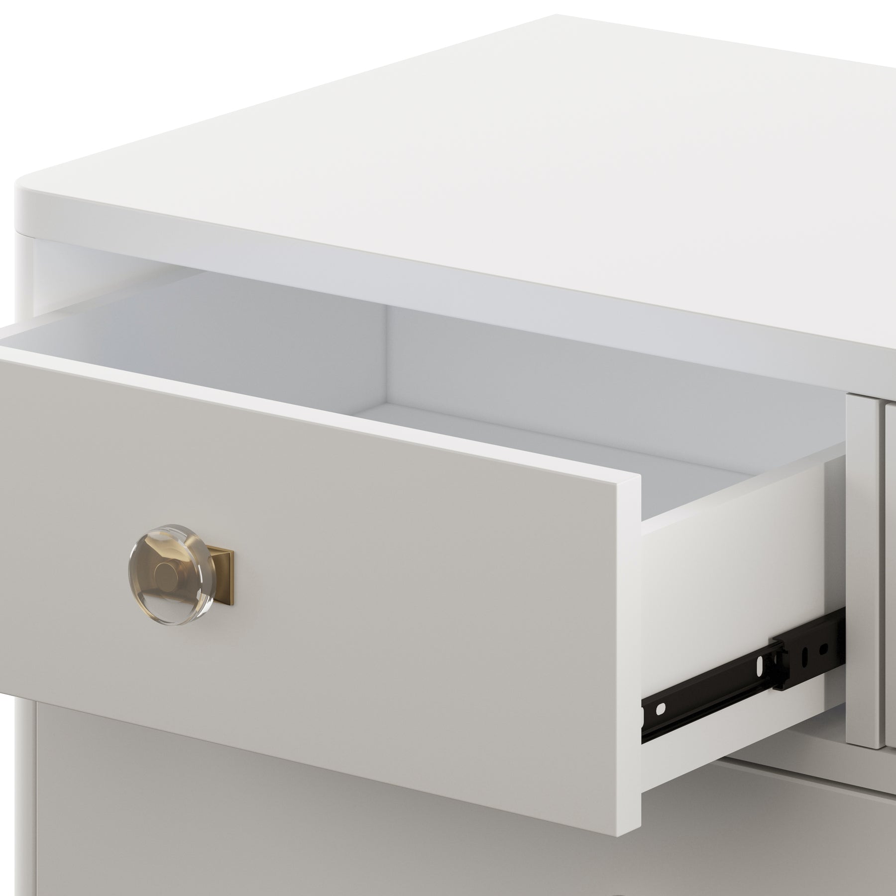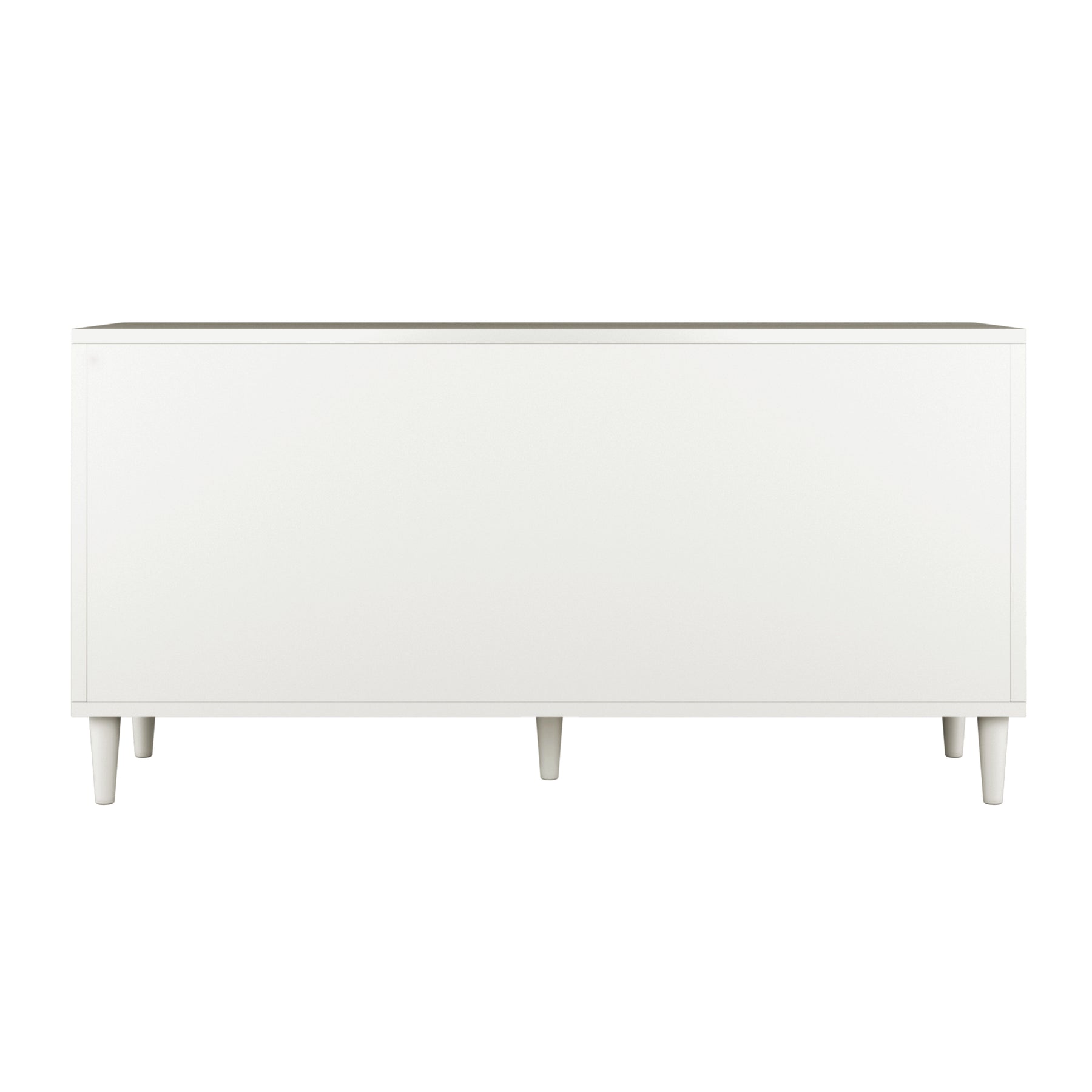 Mid-century modern dresser design offers maximum style with minimalist flair,Base dresser only; optional matching dresser mirror sold separately,White oak-hued finish features attractive natural wood grain detailing,Clear acrylic drawer knob with brass accent provides a handsome vintage-look touch,Crafted of manufactured wood for stability and longevity,Simple assembly required to attach four legs to base unit