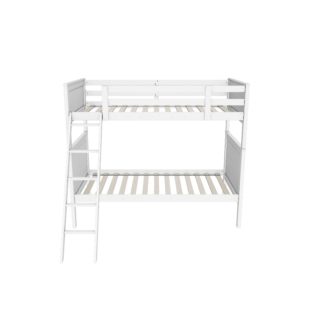 , Twin over Twin Bunk Bed, , Includes upper and lower bunk bed panels, rails, roll slats and ladder;Made with solid hardwood frames and MDF substrate;White finish;Top bunk with protective side rails;Sturdy ladder leads to top bunk;The Consumer Product Safety Commission states top bunks not be used for children under 6 years of age;Included roll slats eliminate need for foundation/box spring;Mattresses available, sold separately;Assembly required;Bed is not compatible with an adjustable base