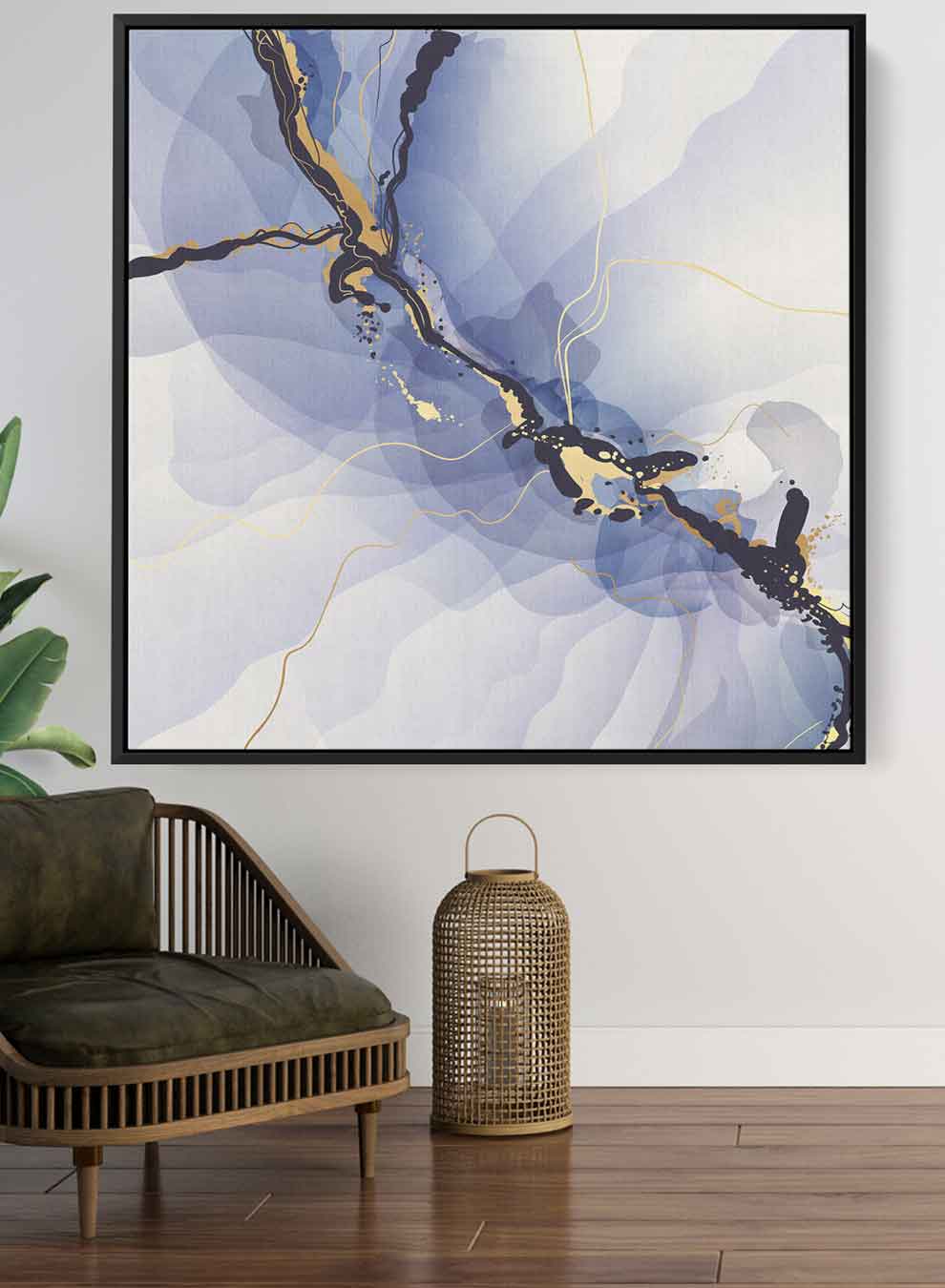 Square Canvas Wall Art Stretched Over Wooden Frame with Black Floating Frame and Blue Abstract Painting