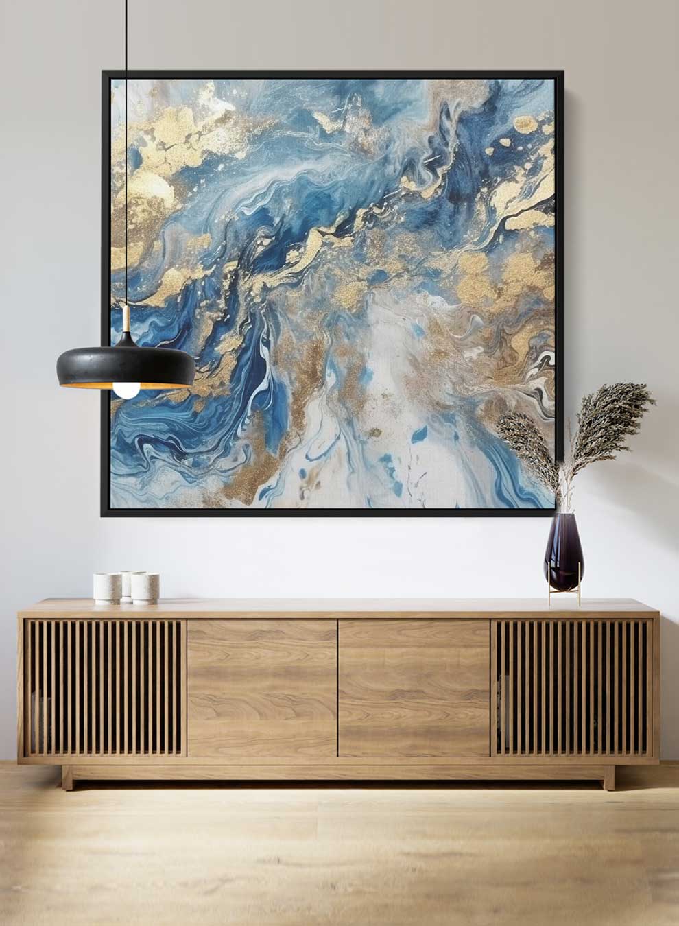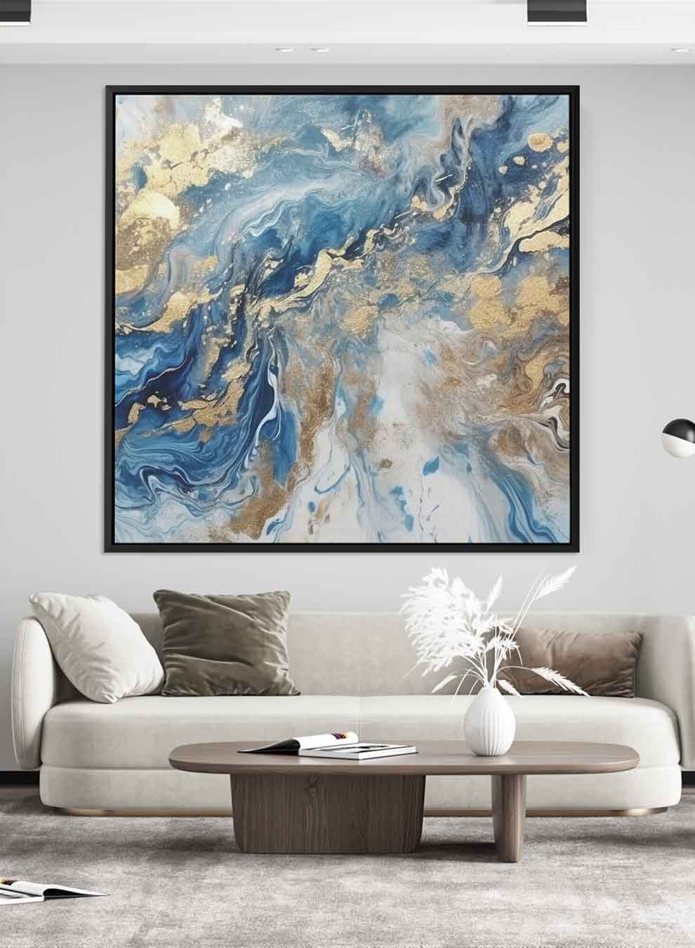 Square Canvas Wall Art Stretched Over Wooden Frame with Black Floating Frame and Shades Of Blue Marble Painting