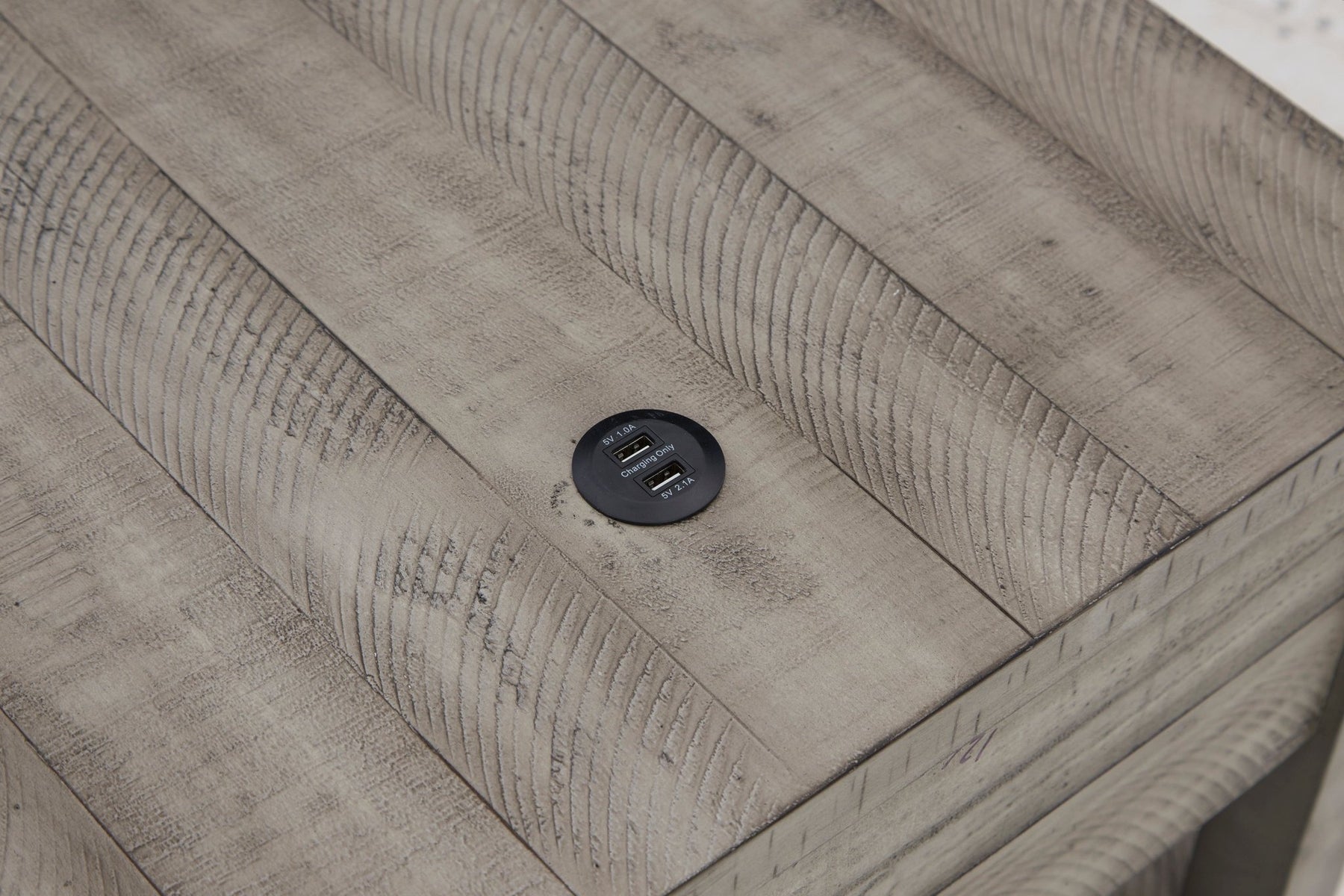 Balancing chic flair with a relaxed sensibility, the Naydell end table strikes just the right tone for rustic sophistication. Beautifully clean lines are subtly enhanced with relaxed distressing and saw marks for authentic barn wood character. Featuring two drawers and a dual USB port to keep your devices conveniently charged, this end table has just enough flair and functionality.