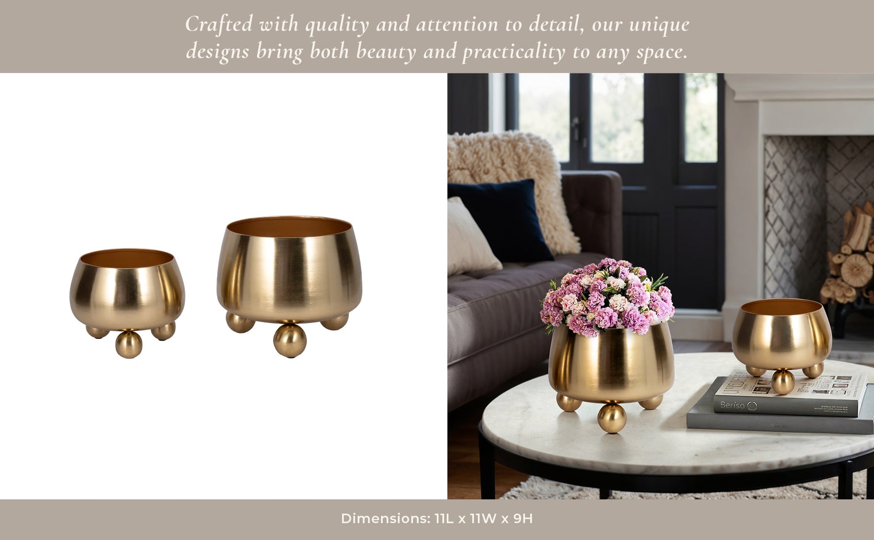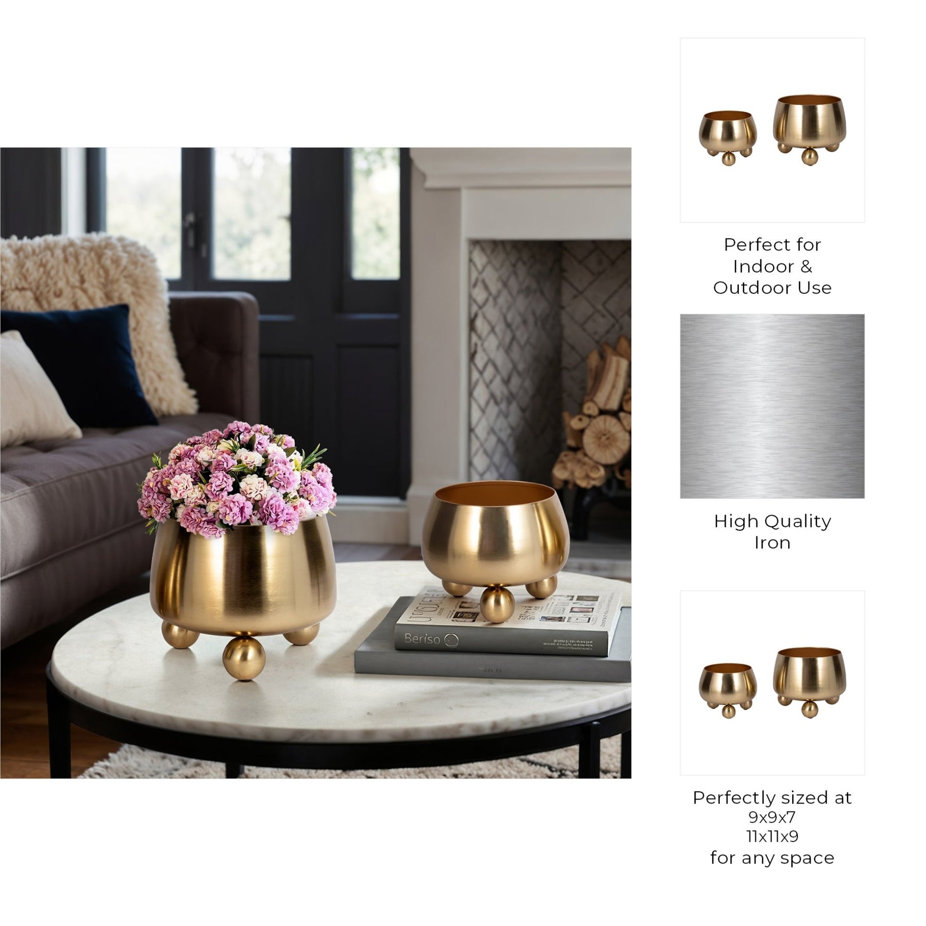 S/2 9/11" Round Metal Planters With Ball Feet, Gld - Al Rugaib Furniture