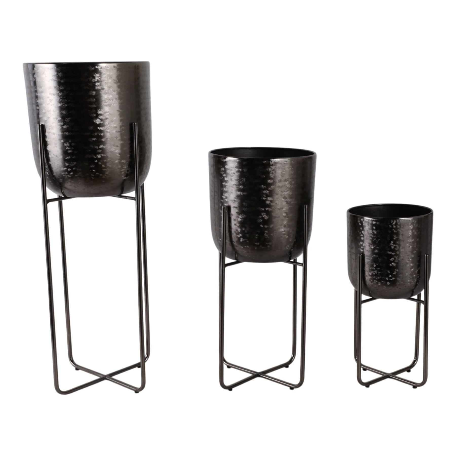 S/3 15/20/27" Etched Metal Planter On Stand, Black