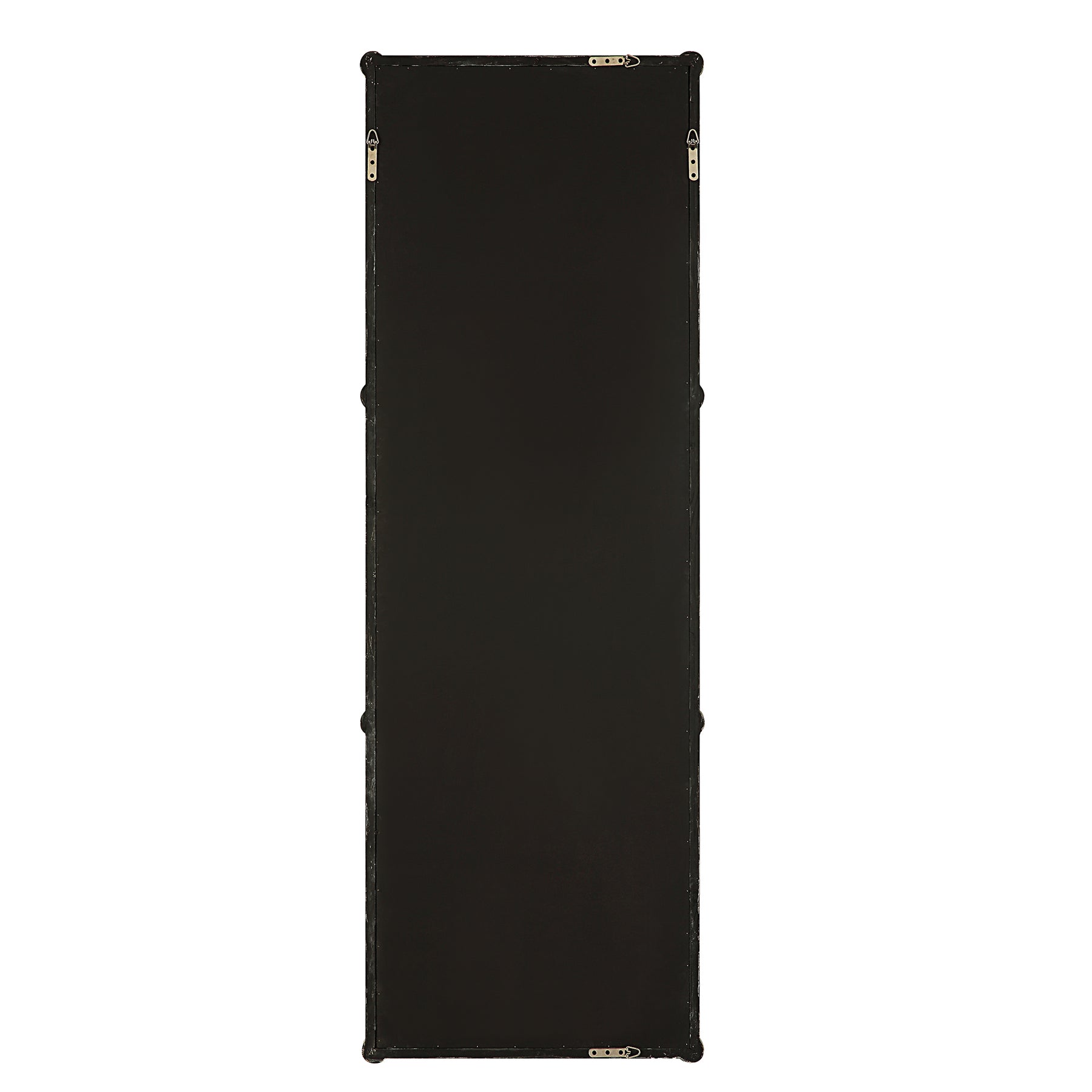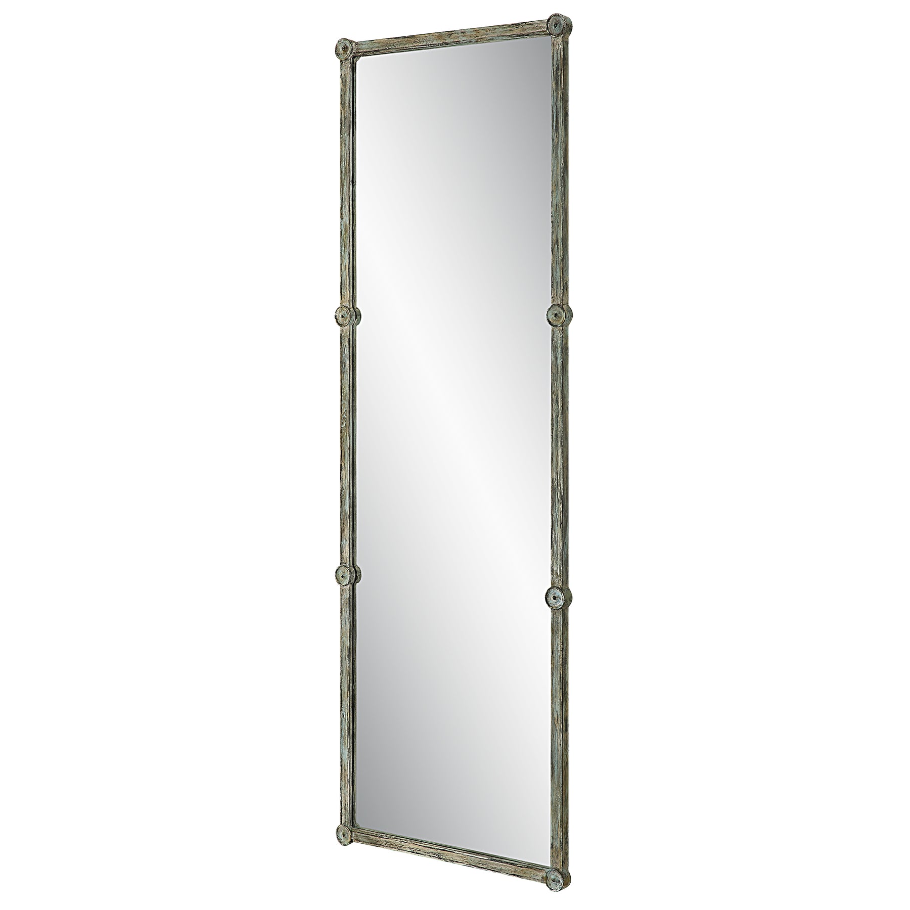 This dressing mirror showcases a traditional design with channeled frame and medallion accents featuring a patinaed finish of weathered verdigris green with rustic black undertones, antique distressing and a light gray wash.